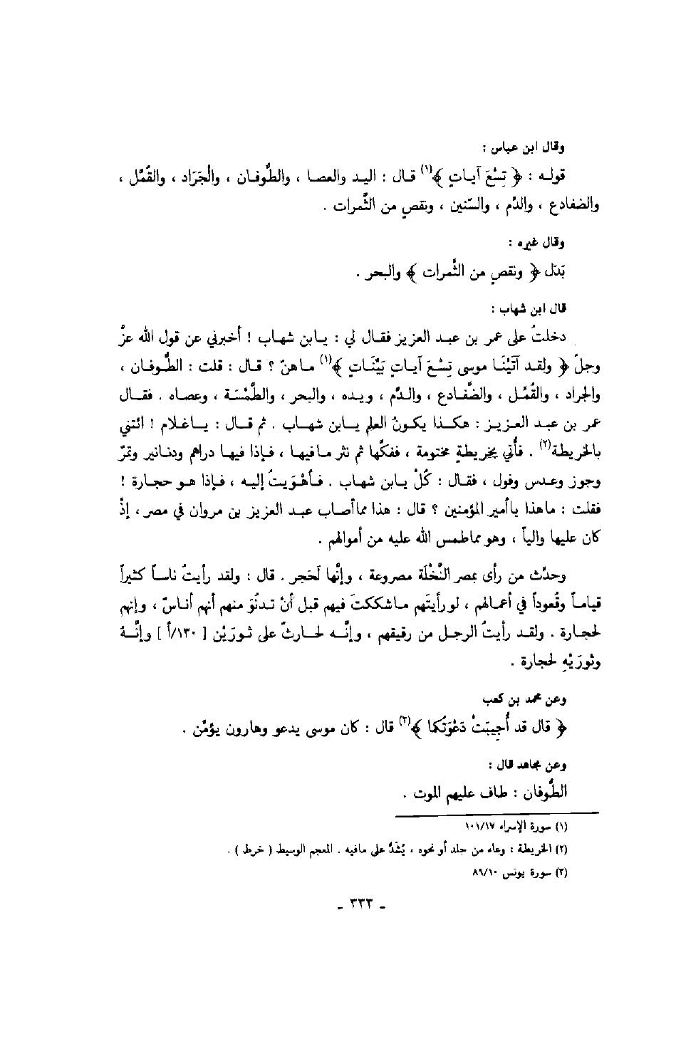 دخلت على عمر بن عبد العزيز فقال لي: يا بن شهاب! أخبرني عن قول الله عز وجل " ولقد آتينا موسى تسع آيات بينات " ما هن؟ قال: قلت: الطوفان، والجراد، والقمل، والضفادع، والدم، ويده، والبحر، والطمسة، وعصاه. فقال عمر بن عبد العزيز: هكذا يكون العلم يابن شهاب. ثم قال: يا غلام! ائتني بالخريطة. فأتي بخريطة مختومة، ففكها ثم نثر ما فيها، فإذا فيها دراهم ودنانير وتمر وجوز وعدس وفول، فقال: كل يابن شهاب. فأهويت إليه، فإذا هو حجارة! فقلت: ما هذا يا أمير المؤمنين؟ قال: هذا مما أصاب عبد العزيز بن مروان في مصر، إذ كان عليها والياً، وهو مما طمس الله عليه من أموالهم.