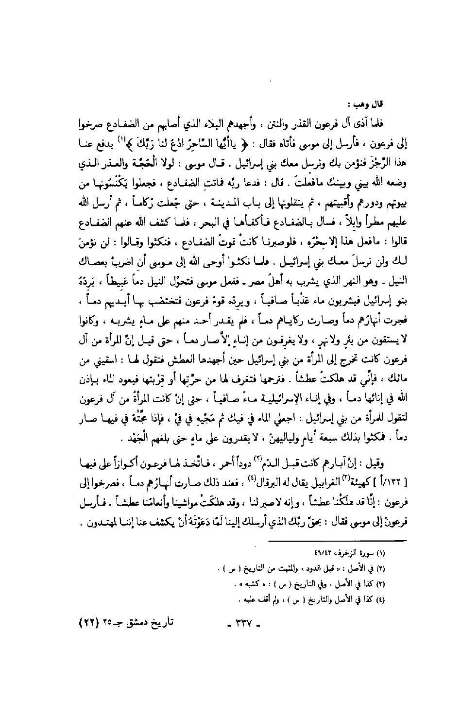 فلما آذى آل فرعون القذر والنتن، وأجهدهم البلاء الذي أصابهم من الضفادع صرخوا إلى فرعون، فأرسل إلى موسى فأتاه فقال: " يا أيها الساحر ادع لنا ربك " يدفع عنا هذا الرجز فنؤمن بك ونرسل معك بني إسرائيل. قال موسى: لولا الحجة والعذر الذي وضعه الله بيني وبينك ما فعلت. قال: فدعا ربه فماتت الضفادع، فجعلوا يكنسونها من بيوتهم ودورهم وأقبيتهم، ثم ينتقلونها إلى باب المدينة، حتى جعلت ركاماً، ثم أرسل الله عليهم مطراً وابلاً، فسال بالضفادع فأكفاها في البحر، فلما كشف الله عنهم الضفادع قالوا: ما فعل هذا إلا سحره، فلو صبرنا كانت تموت الضفادع، فنكثوا وقالوا: لن نؤمن لك ولن نرسل معك بني إسرائيل. فلما نكثوا أوحى الله إلى موسى أن اضرب بعصاك النيل - وهو النهر الذي يشرب به أهل مصر - ففعل موسى فتحول النيل دماً عبيطاً، يرده بنو إسرائيل فيشربون ماء عذباً صافياً، ويرده قوم فرعون فتختضب بها أيديهم دماً، فجرت أنهارهم دماً وصارت ركاياهم دماً، فلم يقدر أحد منهم على ماء يشربه، وكانوا لا يستقون من بئر ولا نهر، ولا يغرفون من إناء إلا صار دماً، حتى قيل إن المرأة من آل فرعون كانت تخرج إلى المرأة من بني إسرائيل حين أجهدها العطش فتقول لها: اسقيني من مائك، فإني قد هلكت عطشاً. فترحمها فتغرف لها من جرتها أو قربتها فيعود الماء بإذن الله في إنائها دماً، وفي إناء الإسرائيلية ماء صافياً، حتى إن كانت المرأة من آل فرعون لتقول للمرأة من بني إسرائيل: اجعلي الماء في فيك ثم مجيه في في، فإذا مجته في فيها صار دماً. فمكثوا بذلك سبعة أيام ولياليهن، لا يقدرون على ماء حتى بلغهم الجهد.