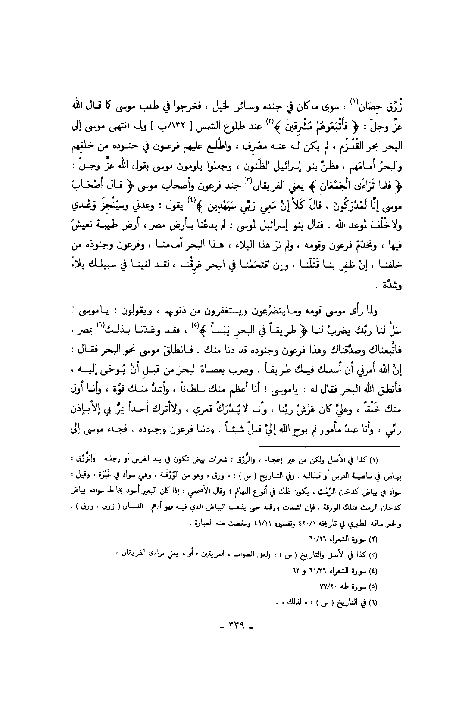زرق حصان، سوى ما كان في جنده وسائر الخيل، فخرجوا في طلب موسى كما قال الله عز وجل: " فأتبعوهم مشرقين " عند طلوع الشمس ولما انتهى موسى إلى بحر القلزم، لم يكن له عنه مصرف، واطلع عليهم فرعون في جنوده من خلفهم والبحر أمامهم، فظن بنو إسرائيل الظنون، وجعلوا يلومون موسى بقول الله عز وجل: " فلما تراءى الجمعان " يعني الفريقان جند فرعون وأصحاب موسى " قال أصحاب موسى إنا لمدركون، قال كلا إن معي ربي سيهدين " يقول: وعدني وسينجز وعدي ولا خلف لموعد الله. فقال بنو إسرائيل لموسى: لم يدعنا بأرض مصر، أرض طيبة نعيش فيها، ونخدم فرعون وقومه، ولم نر هذا البلاء، هذا البحر أمامنا، وفرعون وجنوده من خلفنا، إن ظفر بنا قتلنا، وإن اقتحمنا في البحر غرقنا، لقد لقينا في سبيلك بلاء وشدة.
