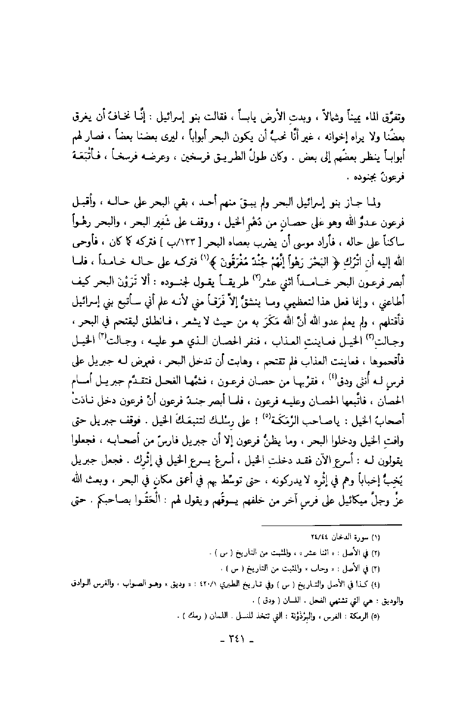 ولما جاز بنو إسرائيل البحر ولم يبق منهم أحد، بقي البحر على حاله، وأقبل فرعون عدو الله وهو على حصان من دهم الخيل، ووقف على شفير البحر، والبحر رهواً ساكناً على حاله، فأراد موسى أن يضرب بعصاه البحر فتركه كما كان، فأوحى الله إليه أن أترك " البحر رهواً إنهم جند مغرقون " فتركه على حاله خامداً، فلما أبصر فرعون البحر خامداً اثني عشر طريقاً يقول لجنوده: ألا ترون البحر كيف أطاعني، وإنما فعل هذا لتعظيمي وما ينشق إلا فرقاً مني لأنه علم أني سأتبع بني إسرائيل فأقتلهم، ولم يعلم عدو الله أن الله مكر به من حيث لا يشعر، فانطلق ليقتحم في البحر، وجالت الخيل فعاينت العذاب، فنفر الحصان الذي هو عليه، وجالت الخيل فأقحموها، فعاينت العذاب فلم تقتحم، وهابت أن تدخل البحر، فعرض له جبريل على فرس له أنثى ودق، فقربها من حصان فرعون، فشمها الفحل فتقدم جبريل أمام الحصان، فاتبعها الحصان وعليه فرعون، فلما أبصر جند فرعون أن فرعون دخل نادت أصحاب الخيل: يا صاحب الرمكة! على رسلك لتتبعك الخيل. فوقف جبريل حتى وافت الخيل ودخلوا البحر، وما يظن فرعون إلا أن جبريل فارس من أصحابه، فجعلوا يقولون له: أسرع الآن فقد دخلت الخيل، أسرع يسرع الخيل في إثرك. فجعل جبريل يخب إخباباً وهم في إثره لا يدركونه، حتى توسط بهم في أعمق مكان في البحر، وبعث الله عز وجل ميكائيل على فرس آخر من خلفهم يسوقهم ويقول لهم: التحقوا بصاحبكم. حتى
