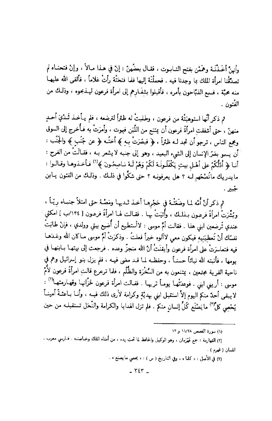 وأنهن أخذنه وهممن بفتح التابوت، فقال بعضهن: إن في هذا مالاً، وإن فتحناه لم تصدقنا امرأة الملك بما وجدنا فيه. فحملنه فيه. فحملنه إليها فلما فتحته رأت غلاماً، فألقى الله عليها منه محبة، فسمع الذباحون بأمره، فأقبلوا بشفارهم إلى امرأة فرعون ليذبحوه، وذلك من الفتون.