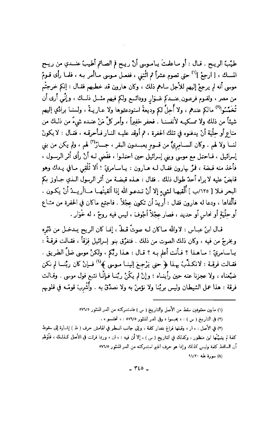 طيب الريح. قال: أو ما علمت يا موسى أن ريح فم الصائم أطيب عندي من ريح المسك، ارجع حتى تصوم عشراً ثم ائتني، ففعل موسى ما أمر به، فلما رأى قوم موسى أنه لم يرجع إليهم للأجل ساءهم ذلك، وكان هارون قد خطبهم فقال: إنكم خرجتم من مصر، ولقوم فرعون عندكم عوار وودائع ولكم فيهم مثل ذلك، وإني أرى أن تخمسوا مالكم عندهم، ولا أحل لكم وديعة استودعتموها ولا عارية، ولسنا برادي إليهم شيئاً من ذلك ولا ممسكيه لأنفسنا، فحفر حفيراً، وأمر كل من عنده شيء من ذلك من متاع أو حلية أن يدفنوه في تلك الحفرة ثم أوقد عليه النار فأحرقه، فقال: لا يكون لنا ولا لهم. وكان السامري من قوم يعبدون البقر، جار لهم، ولم يكن من بني إسرائيل، فاحتمل مع موسى وبني إسرائيل حين احتملوا، فقضي له أن رأى أثر الرسول، فاخذ منه قبضة، فمر بهارون فقال له هارون: يا سامري! ألا تلقي ما في يدك وهو قابض عليه لا يراه أحد طوال ذلك. فقال: هذه قبضة من أثر الرسول الذي جاوز بكم البحر فلا ألقيها لشيء إلا أن تدعو الله إذا ألقيتها ما أريد أن يكون. فألقاها، ودعا له هارون فقال: أريد أن تكون عجلاً. فاجتمع ما كان في الحفرة من متاع أو حلية أو نحاس أو حديد، فصار عجلاً أجوف، ليس فيه روح، له خوار.