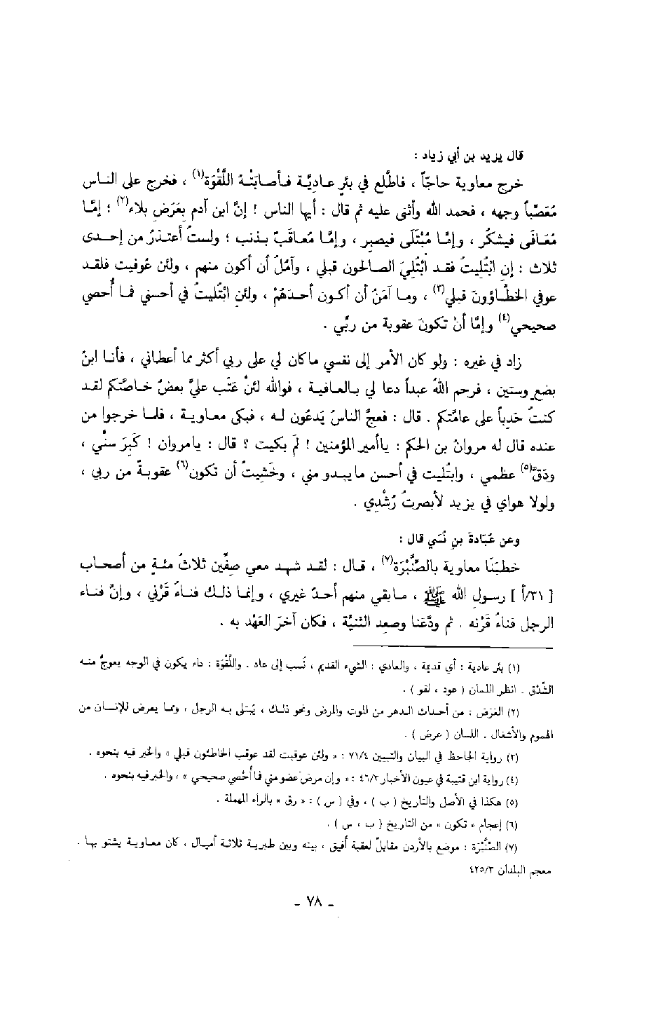 وعن عبادة بن نسي قال: خطبنا معاوية بالصنبرة، قال: لقد شهد معي صفين ثلاث مئة من أصحاب رسول الله صَلَّى اللهُ عَلَيْهِ وَسَلَّمَ، ما بقي منهم أحد غيري، وإنما ذلك فناء قربي، وإن فناء الرجل فناء قرنه. ثم ودعنا وصعد الثنية، فكان آخر العهد به.