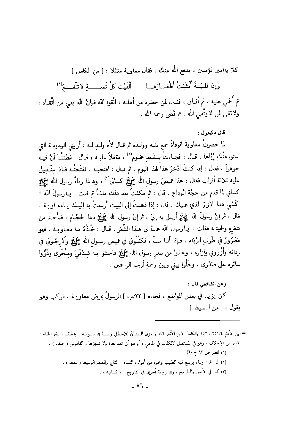 كلا يا أمير المؤمنين، يدفع الله عنك. فقال معاوية متمثلا: من الكامل