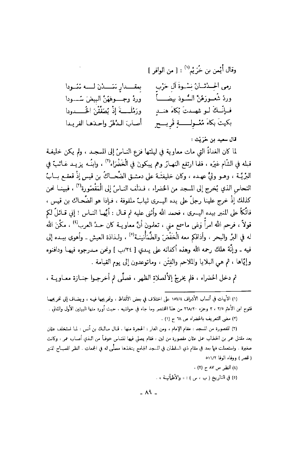 ثم دخل الخضراء، فلم يخرج إلا لصلاة الظهر، فصلى ثم أخرجوا جنازة معاوية،