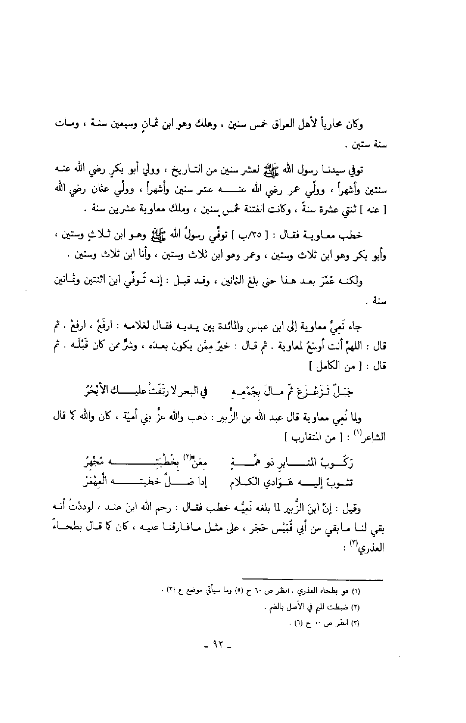 توفي سيدنا رسول الله صَلَّى اللهُ عَلَيْهِ وَسَلَّمَ لعشر سنين من التاريخ، وولي أبو بكر رضي الله عنه سنتين وأشهراً، وولي عمر رضي الله عنه عشر سنين وأشهراً، وولي عثمان رضي الله عنه ثنتي عشرة سنة، وكانت الفتنة لخمس سنين، وملك معاوية عشرين سنة.