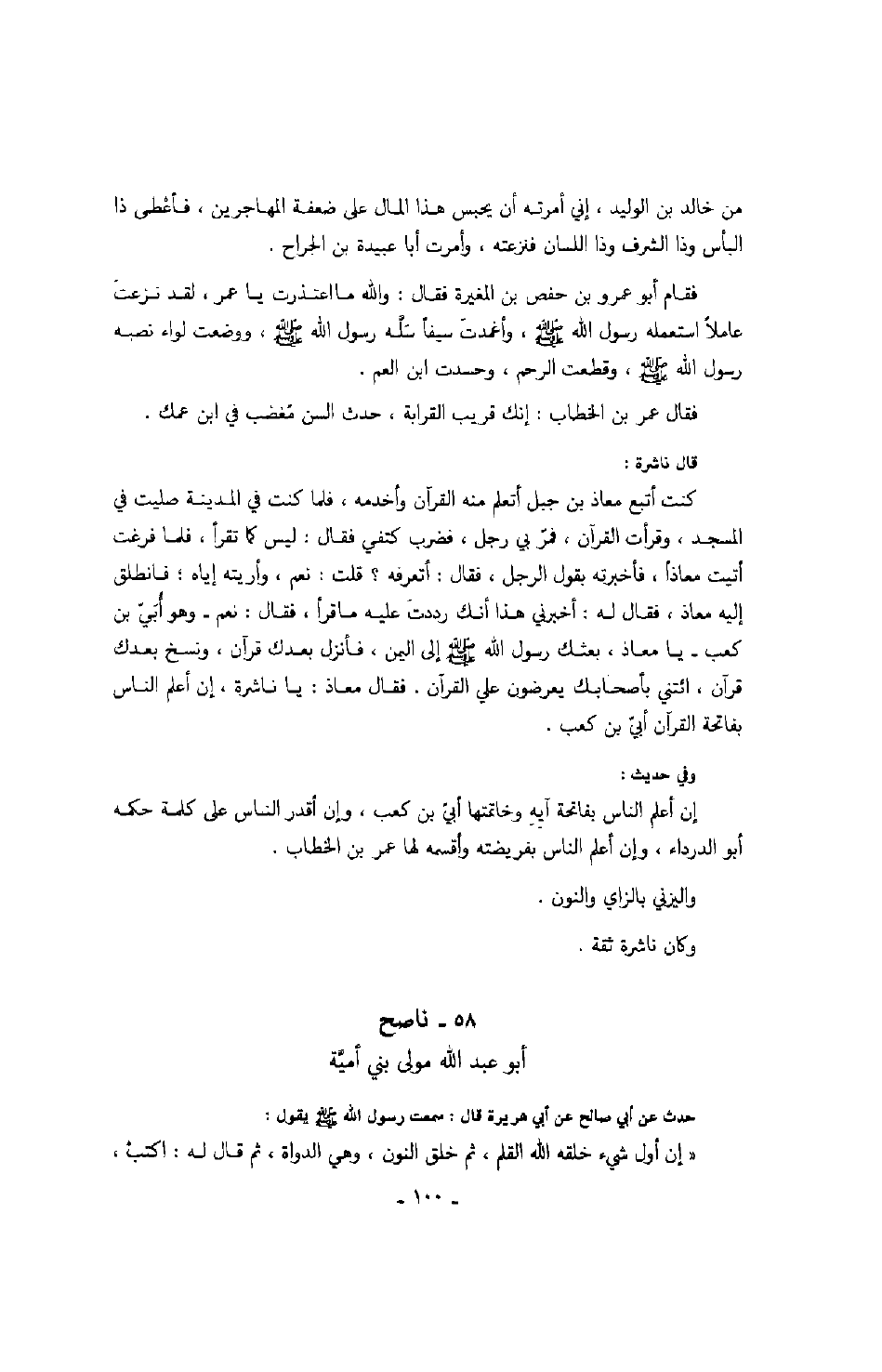 قال ناشرة: كنت أتبع معاذ بن جبل أتعلم منه القرآن وأخدمه، فلما كنت في المدينة صليت في المسجد، وقرأت القرآن، فمر بي رجل، فضرب كتفي فقال: ليس كما تقرأ، فلما فرغت أتيت معاذاً، فأخبرته بقول الرجل، فقال: أتعرفه؟ قلت: نعم، وأريته إياه؛ فانطلق إليه معاذ، فقال له: أخبرني هذا أنك رددت عليه ما قرأ، فقال: نعم - وهو أبي بن كعب - يا معاذ، بعثك رسول الله صَلَّى اللهُ عَلَيْهِ وَسَلَّمَ إلى اليمن، فأنزل بعدك قرآن، ونسخ بعدك قرآن، ائتني بأصحابك يعرضون علي القرآن. فقال معاذ: يا ناشرة، إن أعلم الناس بفاتحة القرآن أبي بن كعب.