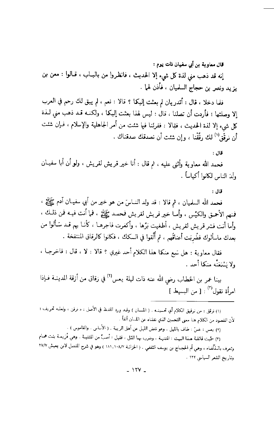 قال معاوية بن أبي سفيان ذات يوم: إنه قد ذهب مني لذة كل شيء إلا الحديث، فانظروا من بالباب، قالوا: معن بن يزيد ونصر بن حجاج السلميان، فأذن لهما.