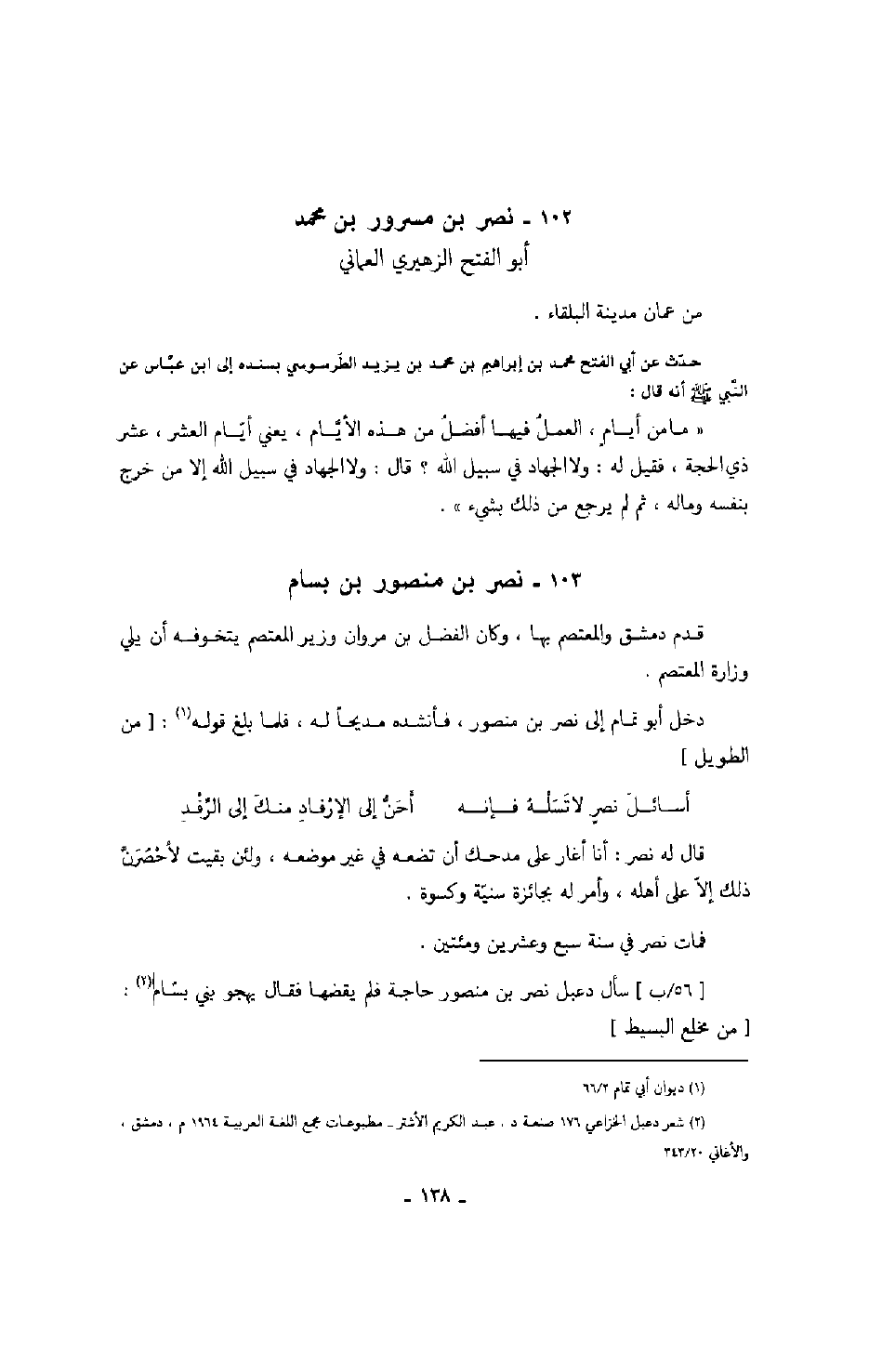 أبو الفتح الزهيري العماني من عمان مدينة البلقاء حدث عن أبي الفتح محمد بن إبراهيم بن محمد بن يزيد الطرسوسي بسنده إلى ابن عباس عن النبي صَلَّى اللهُ عَلَيْهِ وَسَلَّمَ أنه قال: " ما من أيام، العمل فيها أفضل من هذه الأيام، يعني أيام العشر، عشر ذي الحجة، فقيل له: ولا الجهاد في سبيل الله؟ قال: ولا الجهاد في سبيل الله إلا من خرج بنفسه وماله، ثم لم يرجع من ذلك بشيء ".