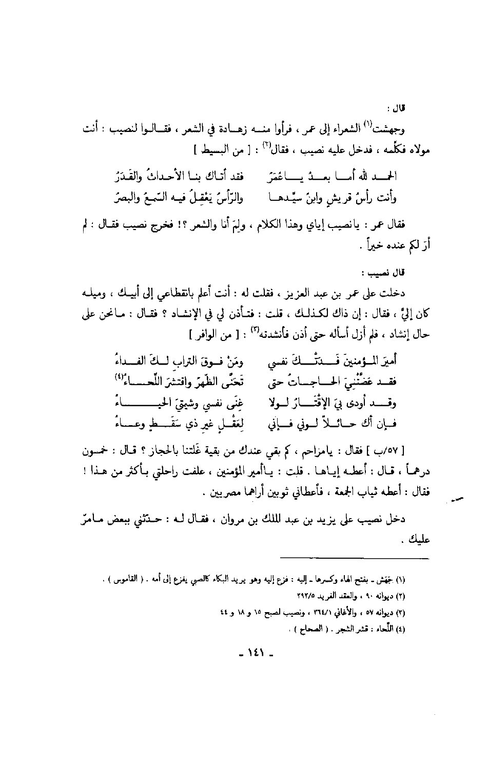 قال نصيب: دخلت على عمر بن عبد العزيز، فقلت له: أنت أعلم بانقطاعي إلى أبيك، وميله كان إلي، فقال: إن ذاك لكذلك، قلت: فتأذن لي في الإنشاد؟ فقال: ما نحن على حال إنشاد، فلم أزل أسأله حتى أذن فأنشدته: " من الوافر "