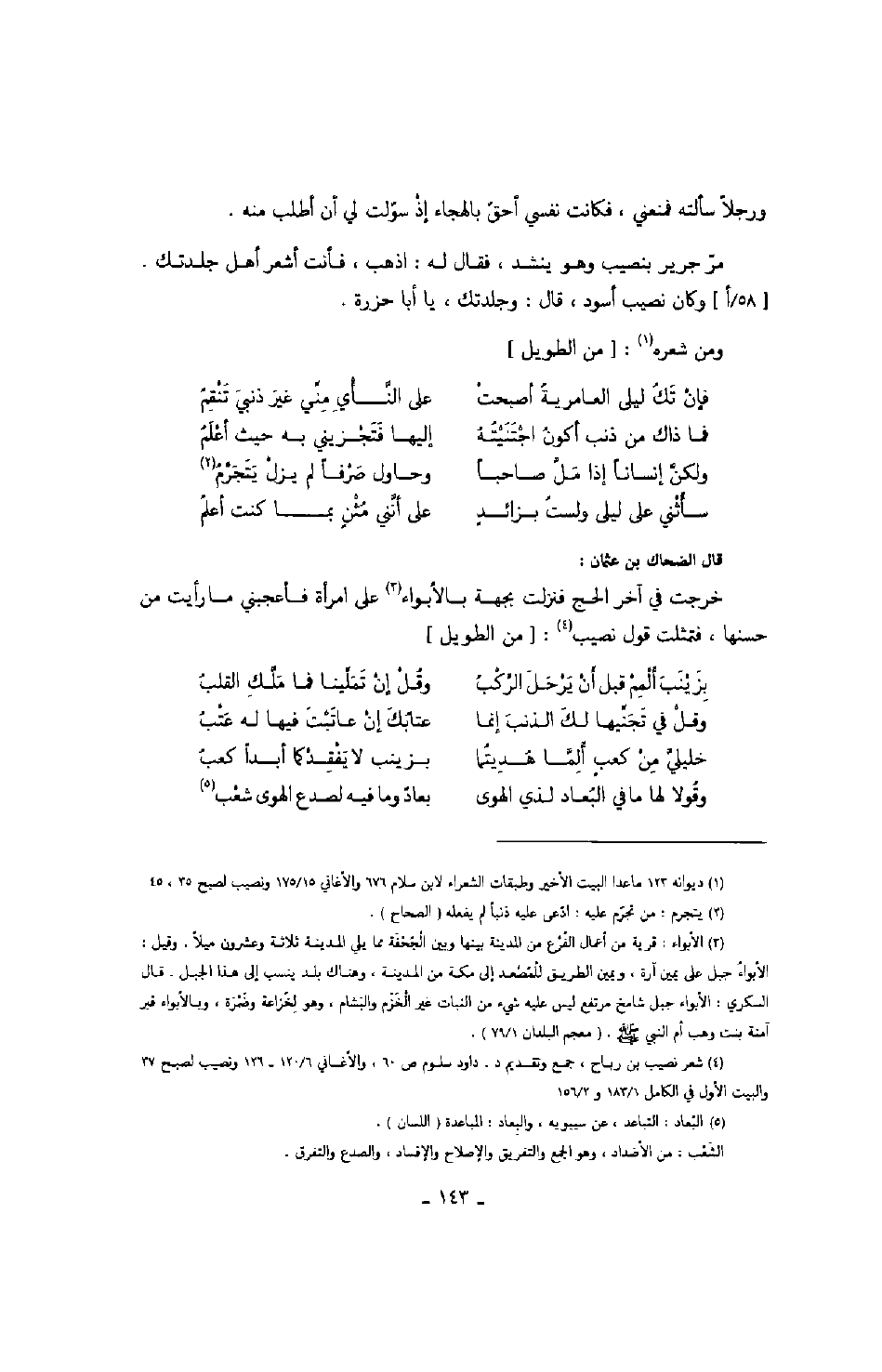 قال الضحاك بن عثمان: خرجت في آخر الحج فنزلت بجهة بالأبواء على امرأة فأعجبني ما رأيت من حسنها، فتمثلت قول نصيب: " من الطويل "