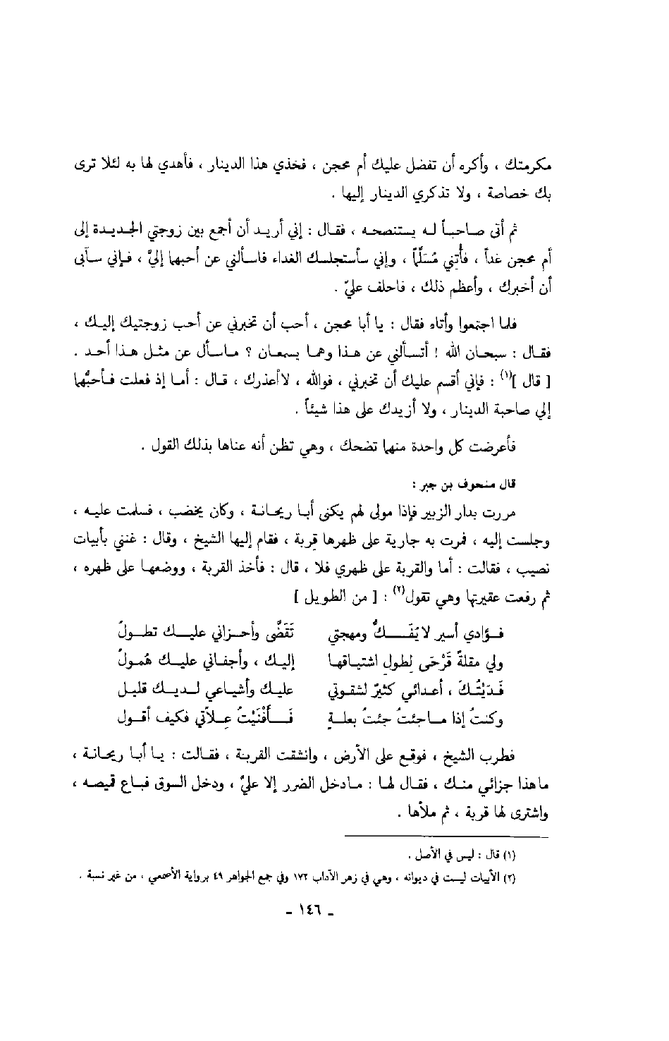 فلما اجتمعوا وأتاه فقال: يا أبا محجن، أحب أن تخبرني عن أحب زوجتيك إليك، فقال: سبحان الله! أتسألني عن هذا وهما يسمعان؟ ما سأل عن مثل هذا أحد. " قال ": فإني أقسم عليك أن تخبرني، فوالله، لا أعذرك، قال: أما إذ فعلت فأحبهما إلي صاحبة الدينار، ولا أزيدك على هذا شيئاً.