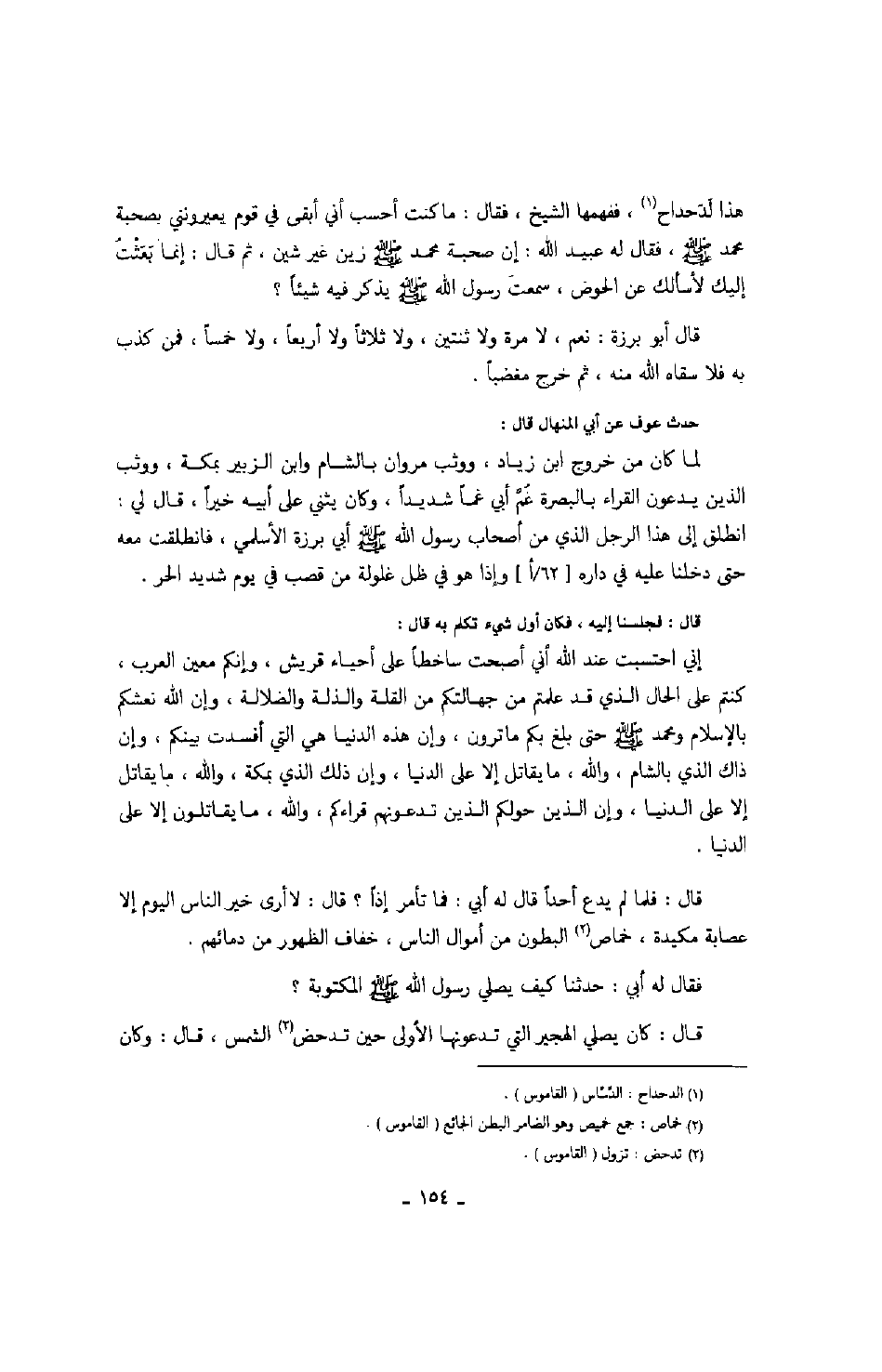 حدث عوف عن أبي المنهال قال: لما كان من خروج ابن زياد، ووثب مروان بالشام وابن الزبير بمكة، ووثب الذين يدعون القراء بالبصرة غم أبي غماً شديداً، وكان يثني على أبيه خيراً، قال لي: انطلق إلى هذا الرجل الذي من أصحاب رسول الله صَلَّى اللهُ عَلَيْهِ وَسَلَّمَ أبي برزة الأسلمي، فانطلقت معه حتى دخلنا عليه في داره وإذا هو في ظل غلولة من قصب في يوم شديد الحر.