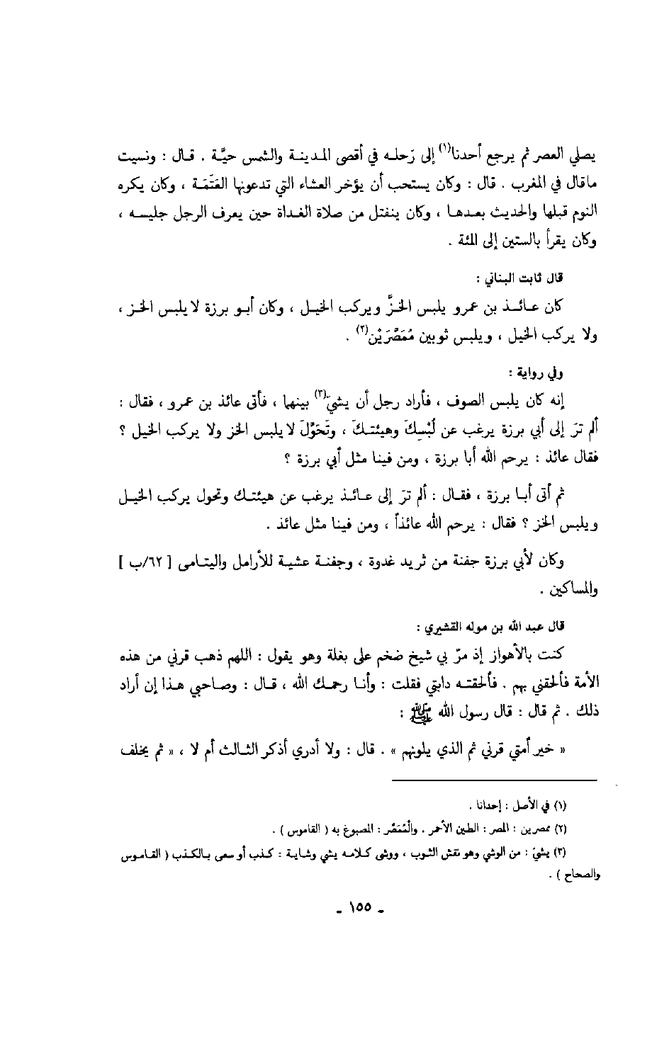 قال ثابت البناني: كان عائذ بن عمرو يلبس الخز ويركب الخيل، وكان أبو برزة لا يلبس الخز، ولا يركب الخيل، ويلبس ثوبين ممصرين.