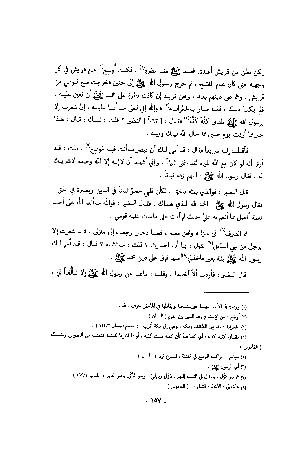 يكن بطن من قريش أعدى لمحمد صَلَّى اللهُ عَلَيْهِ وَسَلَّمَ منا مضرة، فكنت أوضع مع قريش في كل وجهة حتى كان عام الفتح، ثم خرج رسول الله صَلَّى اللهُ عَلَيْهِ وَسَلَّمَ إلى حنين فخرجت مع قومي من قريش، وهم على دينهم بعد، ونحن نريد إن كانت دائرة على محمد صَلَّى اللهُ عَلَيْهِ وَسَلَّمَ أن نعين عليه، فلم يمكنا ذلك، فلما صار بالجعرانة فوالله إني لعلى ما أنا عليه، إن شعرت إلا برسول الله صَلَّى اللهُ عَلَيْهِ وَسَلَّمَ يلقاني كفة كفة فقال: النضير؟ قلت: لبيك، قال: هذا خير مما أردت يوم حنين مما حال الله بينك وبينه.