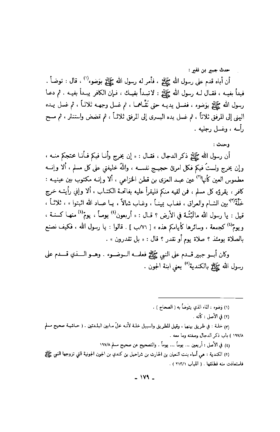 وحدث: أن رسول الله صَلَّى اللهُ عَلَيْهِ وَسَلَّمَ ذكر الدجال، فقال: " إن يخرج وأنا فيكم فأنا محتجكم منه، وإن يخرج ولست فيكم فكل امرئ حجيج نفسه، والله خليفتي على كل مسلم، ألا وإنه مطموس العين كأنها عين عبد العزى بن قطن الخزاعي، ألا وإني رأيته خرج خلة بين الشام والعراق، فغاب يميناً، وغاب شمالاً، يا عباد الله اثبتوا "، ثلاثاً، قيل: يا رسول الله ما لبثه في الأرض؟ قال: " أربعون يوماً، يوم منها كسنة، ويوم كجمعة، وسائرها كأيامكم هذه ". قالوا: يا رسول الله، فكيف نصنع بالصلاة يومئذ؟ صلاة يوم أو نقدر؟ قال: " بل تقدرون ".