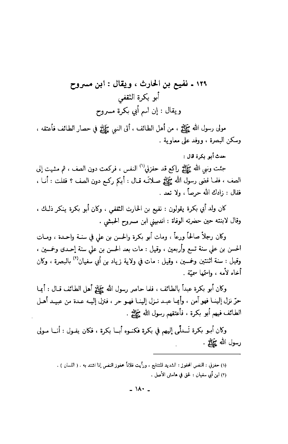 أبو بكرة الثقفي ويقال: إن اسم أبي بكرة مسروح مولى رسول الله صَلَّى اللهُ عَلَيْهِ وَسَلَّمَ، من أهل الطائف، أتى النبي صَلَّى اللهُ عَلَيْهِ وَسَلَّمَ في حصار الطائف فأعتقه، وسكن البصرة، ووفد على معاوية.