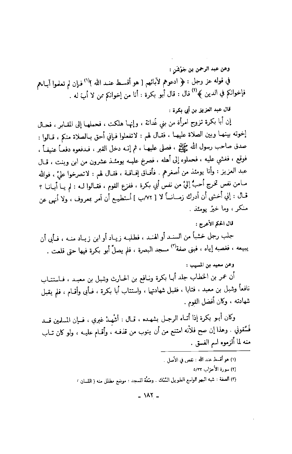 وعن عبد الرحمن بن جوشن: في قوله عز وجل: " ادعوهم لآبائهم " هو أقسط عند الله " فإن لم تعلموا آباءهم فإخوانكم في الدين " قال: قال أبو بكرة: أنا من إخوانكم ممن لا أب له.