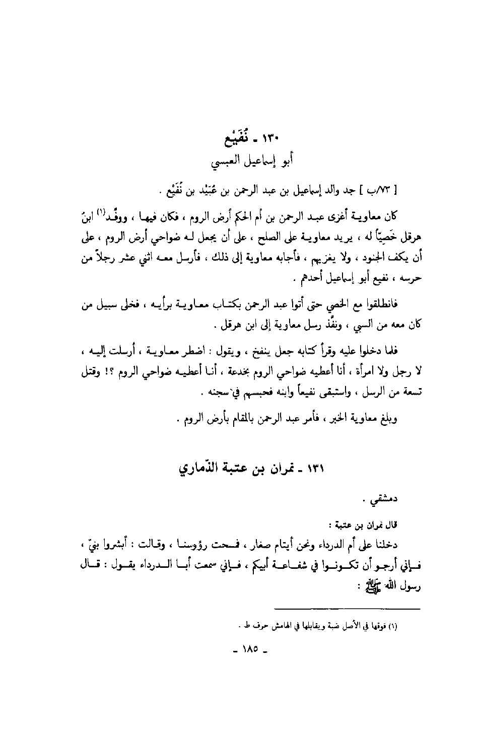كان معاوية أغزى عبد الرحمن بن أم الحكم أرض الروم، فكان فيها، ووفد ابن هرقل خصياً له، يريد معاوية على الصلح، على أن يجعل له ضواحي أرض الروم، على أن يكف الجنود، ولا يغزيهم، فأجابه معاوية إلى ذلك، فأرسل معه اثني عشر رجلاً من حرسه، نفيع أبو إسماعيل أحدهم.