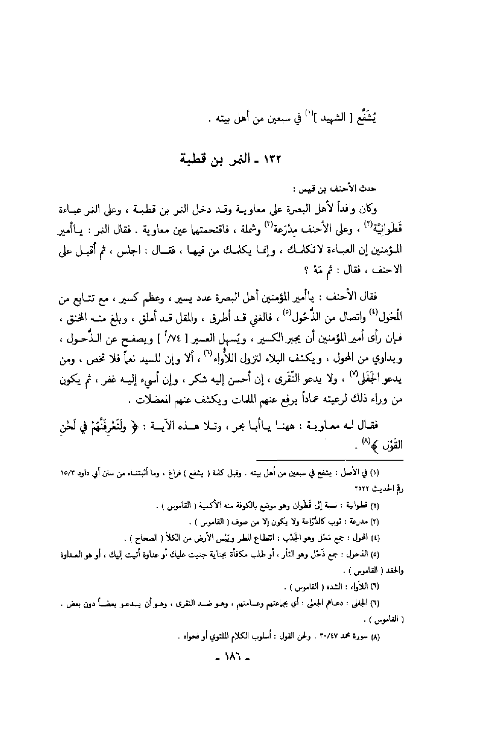 حدث الأحنف بن قيس: وكان وافداً لأهل البصرة على معاوية وقد دخل النمر بن قطبة، وعلى النمر عباءة قطوانية، وعلى الأحنف مدرعة وشملة، فاقتحمتها عين معاوية. فقال النمر: يا أمير المؤمنين إن العباءة لا تكلمك، وإنما يكلمك من فيها، فقال: اجلس، ثم أقبل على الأحنف، فقال: ثم مه؟