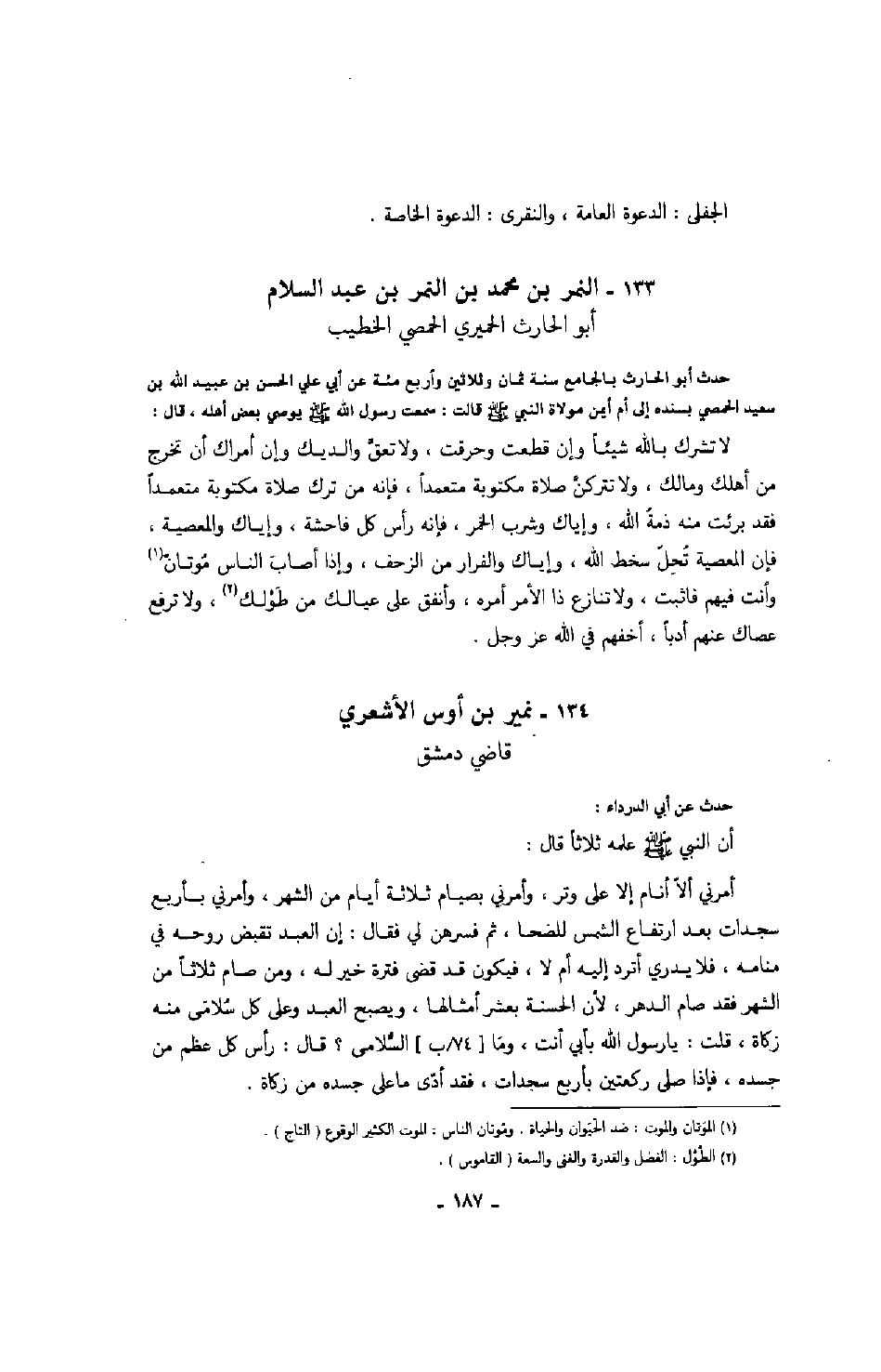 قاضي دمشق حدث عن أبي الدرداء: أن النبي صَلَّى اللهُ عَلَيْهِ وَسَلَّمَ علمه ثلاثاً قال: أمرني ألا أنام إلا على وتر، وأمرني بصيام ثلاثة أيام من الشهر، وأمرني بأربع سجدات بعد ارتفاع الشمس للضحا، ثم فسرهن لي فقال: إن العبد تقبض روحه في منامه، فلا يدري أترد إليه أم لا، فيكون قد قضى فترة خير له، ومن صام ثلاثاً من الشهر فقد صام الدهر، لأن الحسنة بعشر أمثالها، ويصبح العبد وعلى كل سلامى منه زكاة، قلت: يا رسول الله بأبي أنت، وما السلامى؟ قال: رأس كل عظم من جسده، فإذا صلى ركعتين بأربع سجدات، فقد أدى ما على جسده من زكاة.