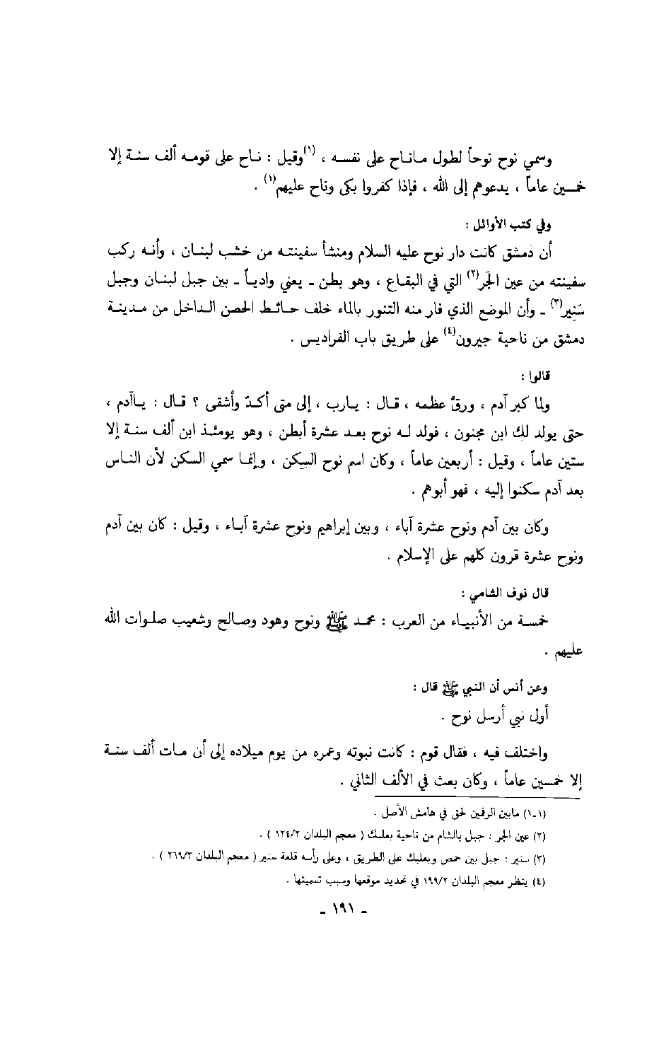 وفي كتب الأوائل: أن دمشق كانت دار نوح عليه السلام ومنشأ سفينته من خشب لبنان، وأنه ركب سفينته من عين الجر التي في البقاع، وهو بطن - يعني وادياً - بين جبل لبنان وجبل سنير - وأن الموضع الذي فار منه التنور بالماء خلف حائط الحصن الداخل من مدينة دمشق من ناحية جيرون على طريق باب الفراديس.