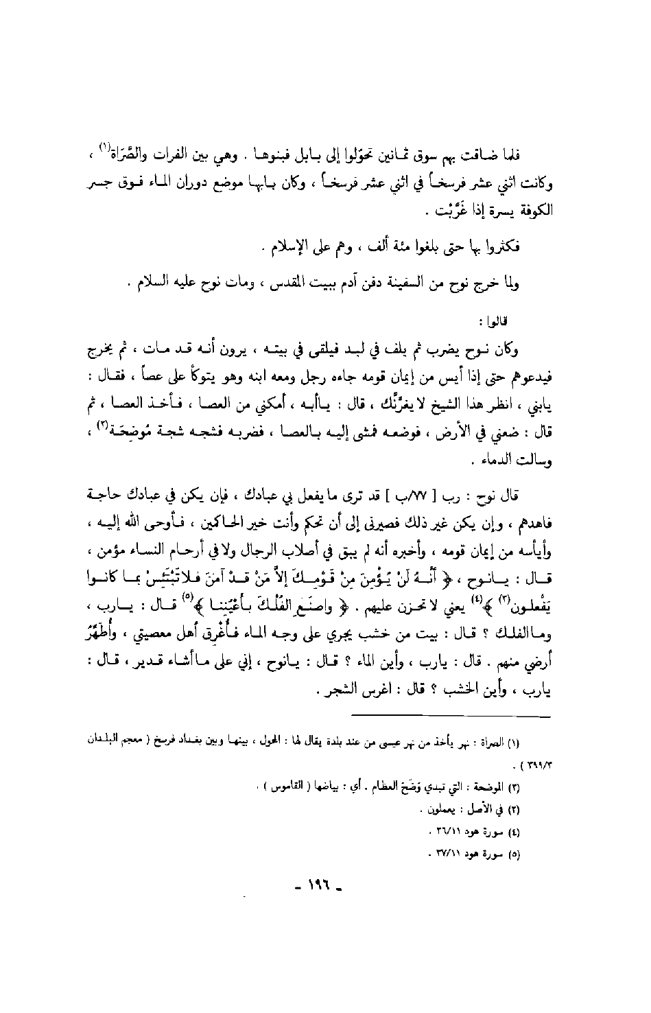 قال نوح: رب قد ترى ما يفعل بي عبادك، فإن يكن في عبادك حاجة فاهدهم، وإن يكن غير ذلك فصيرني إلى أن تحكم وأنت خير الحاكمين، فأوحى الله إليه، وأيأسه من إيمان قومه، وأخبره أنه لم يبق في أصلاب الرجال ولا في أرحام النساء مؤمن، قال: يا نوح، " أنه لن يؤمن من قومك إلا من قد آمن فلا تبتئس بما كانوا يفعلون " يعني لا تحزن عليهم. " واصنع الفلك بأعيننا " قال: يا رب، وما الفلك؟ قال: بيت من خشب يجري على وجه الماء فأعرق أهل معصيتي، وأطهر أرضي منهم. قال: يا رب، وأين الماء؟ قال: يا نوح، إني على ما أشاء قدير، قال: يا رب، وأين الخشب؟ قال: اغرس الشجر.