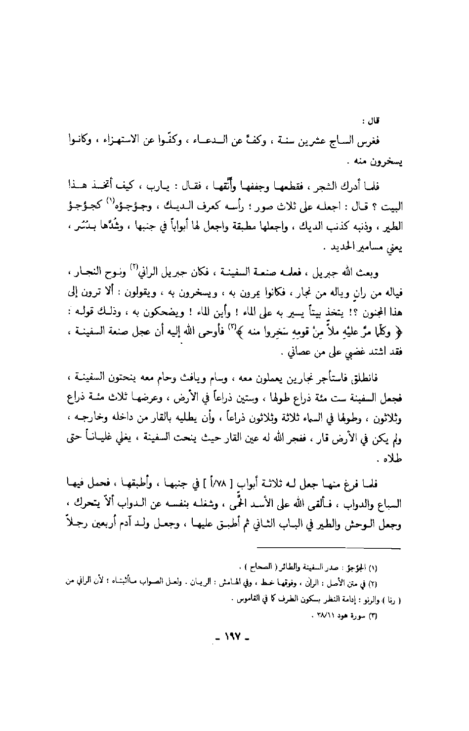 فلما أدرك الشجر، فقطعها وجففها وأنقها، فقال: يا رب، كيف أتخذ هذا البيت؟ قال: اجعله على ثلاث صور؛ رأسه كعرف الديك، وجؤجؤه كجؤجؤ الطير، وذنبه كذنب الديك، واجعلها مطبقة واجعل لها أبواباً في جنبها، وشدها بدسر، يعني مسامير الحديد.