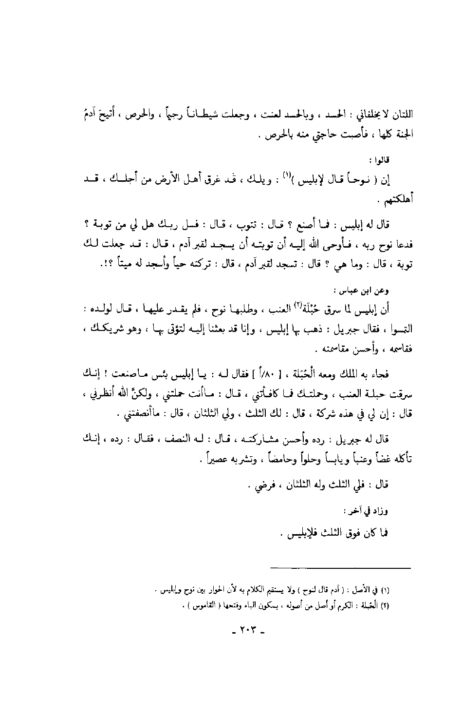فجاء به الملك ومعه الحبلة، فقال له: يا إبليس بئس ما صنعت! إنك سرقت حبلة العنب، وحملتك فما كافأتني، قال: ما أنت حملتني، ولكن الله أنظرني، قال: إن لي في هذه شركة، قال: لك الثلث، ولي الثلثان، قال: ما أنصفتني.
