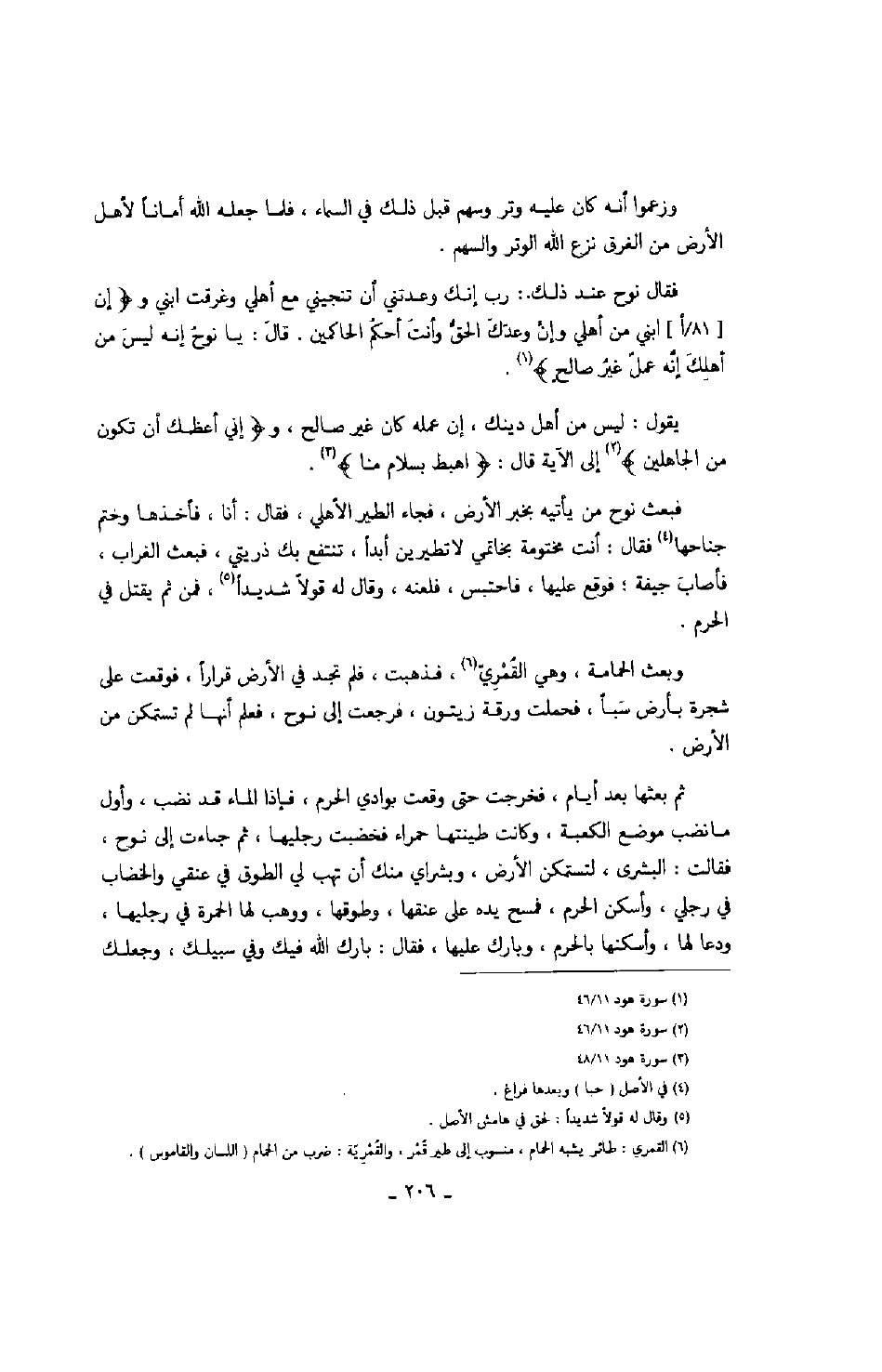 فبعث نوح من يأتيه بخبر الأرض، فجاء الطير الأهلي، فقال: أنا، فأخذها وختم جناحها فقال: أنت مختومة بخاتمي لا تطيرين أبداً، تنتفع بك ذريتي، فبعث الغراب، فأصاب جيفة؛ فوقع عليها، فاحتبس، فلعنه، وقال له قولاً شديداً، فمن ثم يقتل في الحرم.