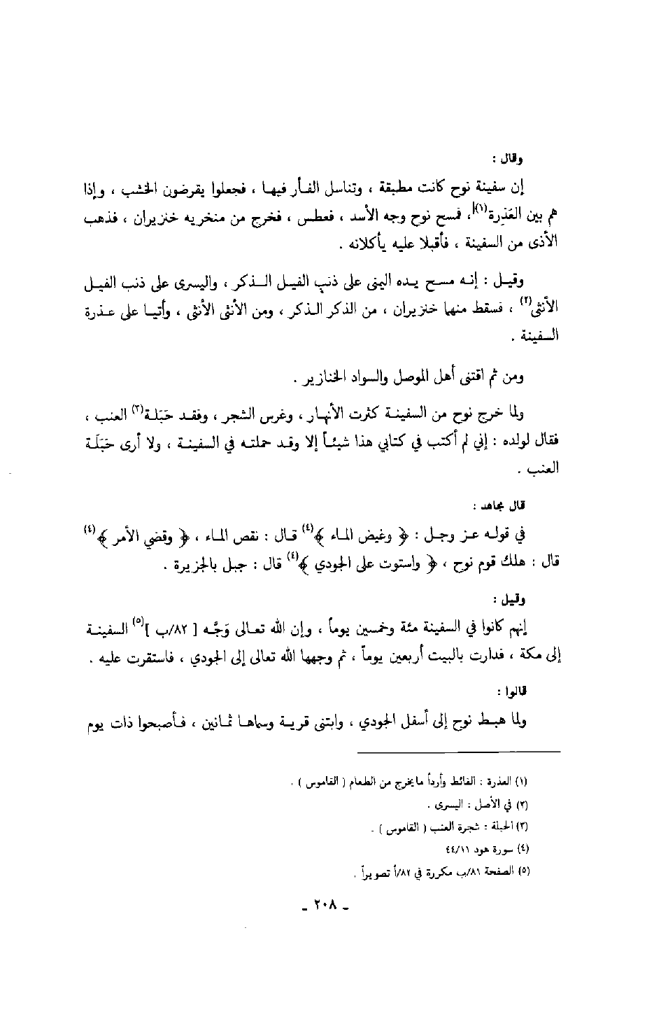 وقال: إن سفينة نوح كانت مطبقة، وتناسل الفأر فيها، فجعلوا يقرضون الخشب، وإذا هم بين العذرة، فمسح نوح وجه الأسد، فعطس، فخرج من منخريه خنزيران، فذهب الأذى من السفينة، فأقبلا عليه يأكلانه.