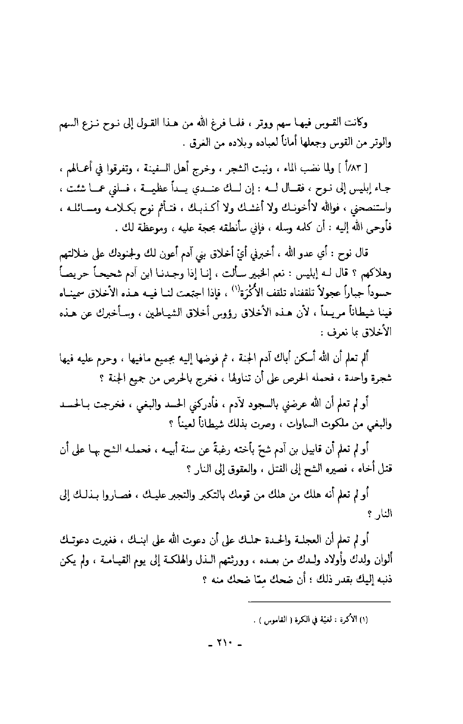 قال نوح: أي عدو الله، أخبرني أي أخلاق بني آدم أعون لك ولجنودك على ضلالتهم وهلاكهم؟ قال له إبليس: نعم الخبير سألت، إنا إذا وجدنا ابن آدم شحيحاً حريصاً حسوداً جباراً عجولاً تلقفناه تلقف الأكرة، فإذا اجتمعت لنا فيه هذه الأخلاق سميناه فينا شيطاناً مريداً، لأن هذه الأخلاق رؤوس أخلاق الشياطين، وسأخبرك عن هذه الأخلاق بما نعرف: ألم تعلم أن الله أسكن أباك آدم الجنة، ثم فوضها إليه بجميع ما فيها، وحرم عليه فيها شجرة واحدة، فحمله الحرص على أن تناولها، فخرج بالحرص من جميع الجنة؟