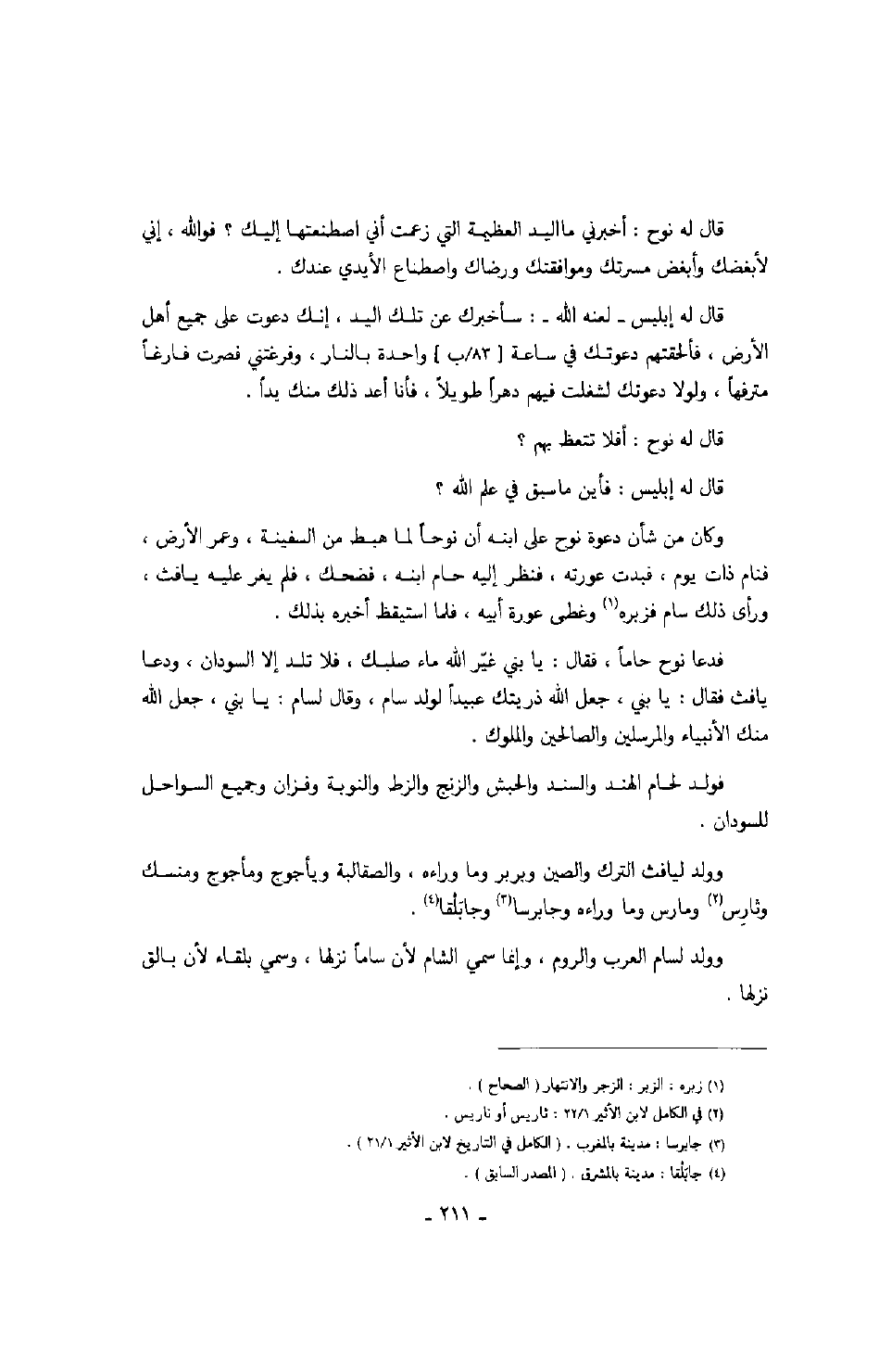 قال له نوح: أفلا تتعظ بهم؟ قال له إبليس: فأين ما سبق في علم الله؟ وكان من شأن دعوة نوح على ابنه أن نوحاً لما هبط من السفينة، وعمر الأرض، فنام ذات يوم، فبدت عورته، فنظر إليه حام ابنه، فضحك، فلم يغر عليه يافث، ورأى ذلك سام فزبره وغطى عورة أبيه، فلما استيقظ أخبره بذلك.