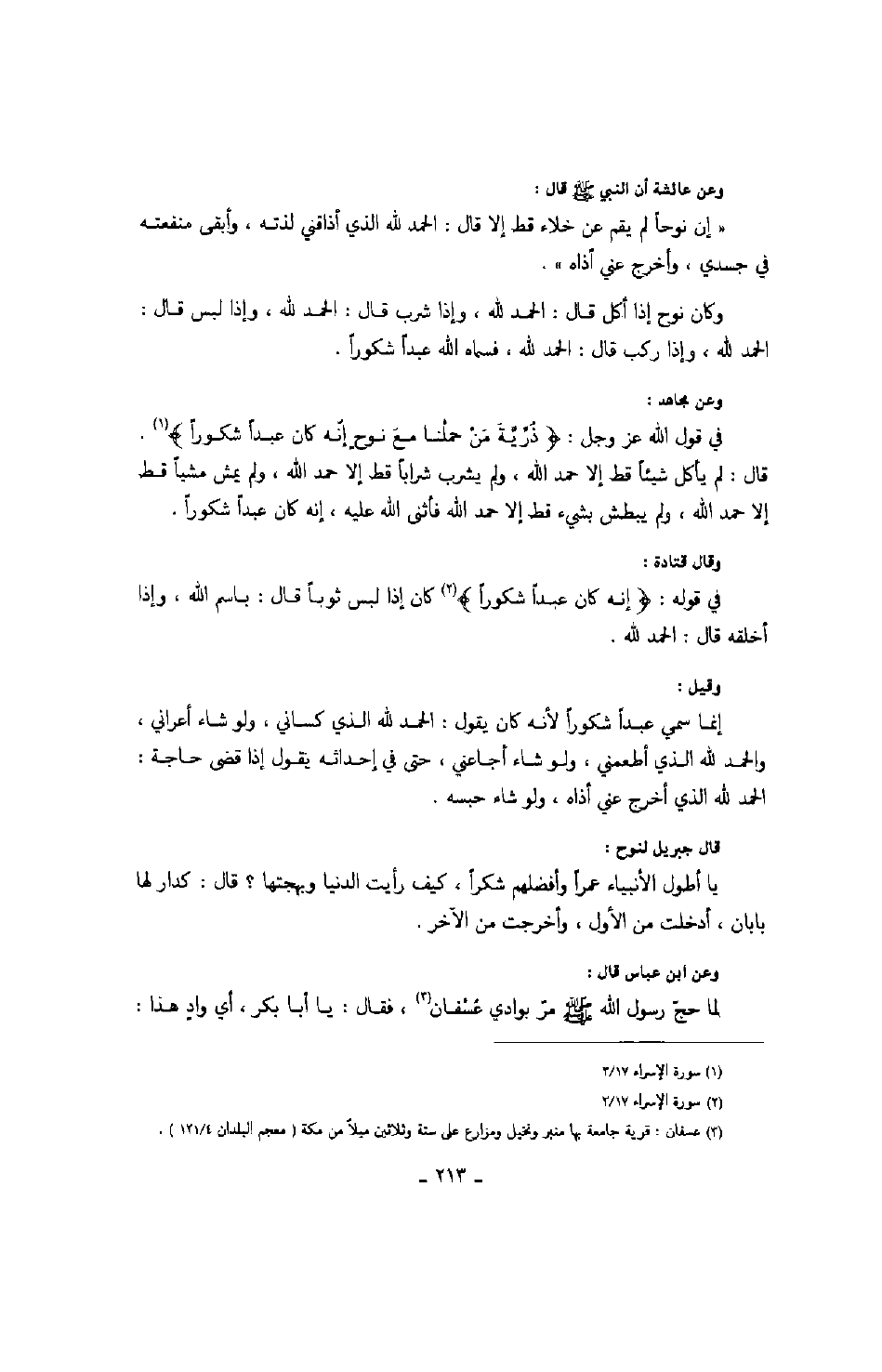 وعن مجاهد: في قول الله عز وجل: " ذرية من حملنا مع نوح إنه كان عبداً شكوراً ". قال: لم يأكل شيئاً قط إلا حمد الله، ولم يشرب شراباً قط إلا حمد الله، ولم يمش مشياً قط إلا حمد الله، ولم يبطش بشيء قط إلا حمد الله فأثنى الله عليه، إنه كان عبداً شكوراً.