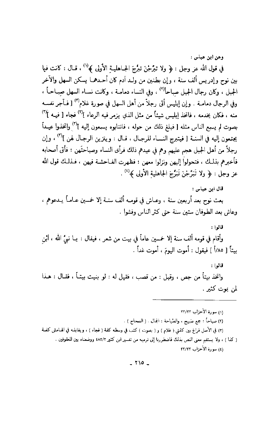 وعن ابن عباس: في قول الله عز وجل: " ولا تبرجن تبرج الجاهلية الأولى "، قال: كانت فيما بين نوح وإدريس ألف سنة، وإن بطنين من ولد آدم كان أحدهما يسكن السهل والآخر الجبل، وكان رجال الجبل صباحاً، وفي النساء دمامة، وكانت نساء السهل صباحاً، وفي الرجال دمامة. وإن إبليس أتى رجلاً من أهل السهل في صورة غلام " فآجر نفسه منه، فكان يخدمه، فاتخذ إبليس شيئاً من مثل الذي يزمر فيه الرعاء " فجاء فيه بصوت لم يسمع الناس مثله فبلغ ذلك من حوله، فانتابوه يسمعون إليه واتخذوا عيداً يجتمعون إليه في السنة فيتبرج النساء للرجال، قال: ويتزين الرجال لهن، وإن رجلاً من أهل الجبل هجم عليهم وهم في عيدهم ذلك فرأى النساء وصباحتهن؛ فأتى أصحابه فأخبرهم بذلك، فتحولوا إليهم ونزلوا معهن؛ فظهرت الفاحشة فيهن، فذلك قول الله عز وجل: " ولا تبرجن تبرج الجاهلية الأولى ".قال ابن عباس: بعث نوح بعد أربعين سنة، وعاش في قومه ألف سنة إلا خمسين عاماً يدعوهم، وعاش بعد الطوفان ستين سنة حتى كثر الناس وفشوا.