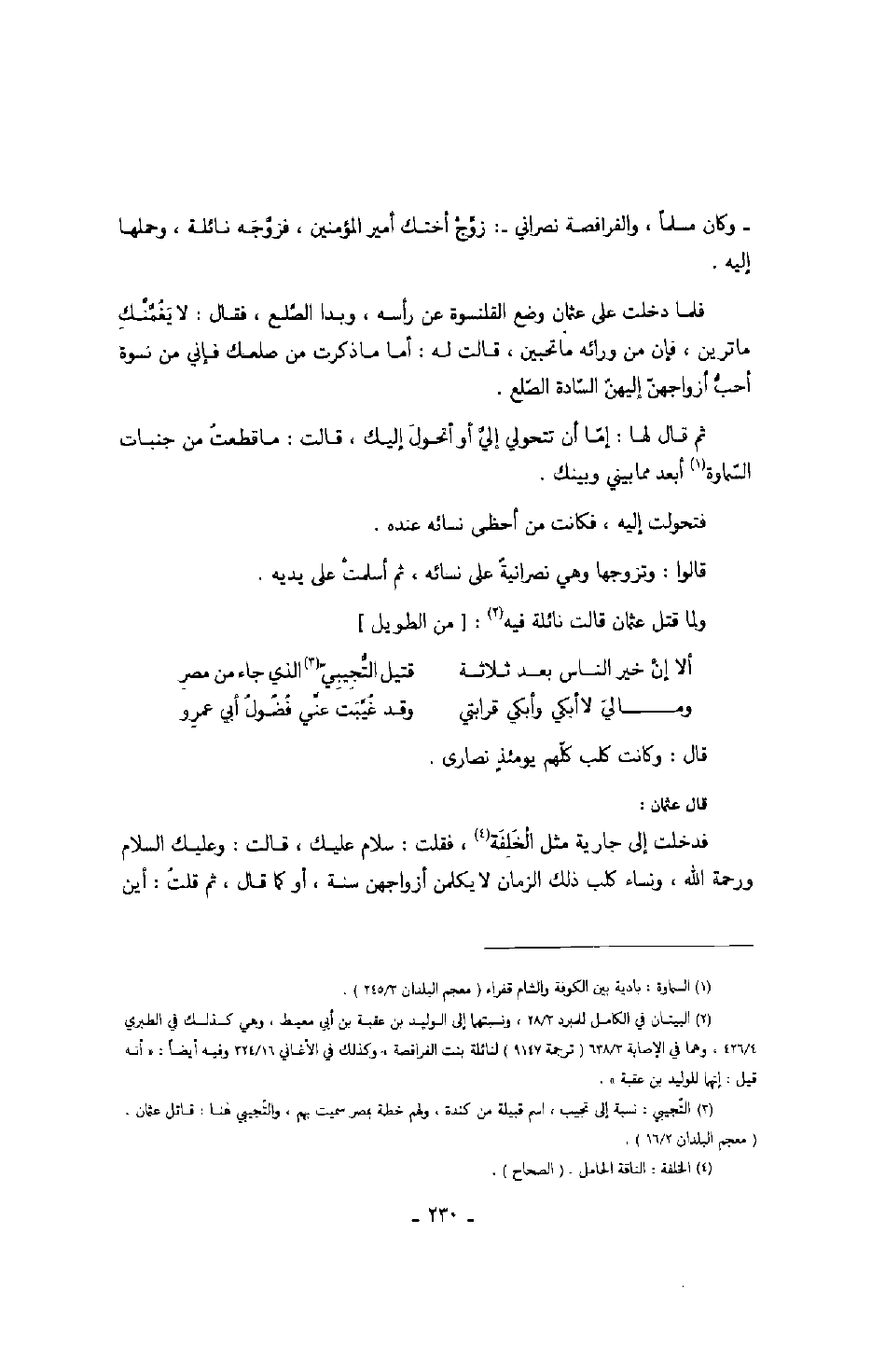 قال عثمان: فدخلت إلى جارية مثل الخلفة، فقلت: سلام عليك، قالت: وعليك السلام ورحمة الله، ونساء كلب ذلك الزمان لا يكلمن أزواجهن سنة، أو كما قال، ثم قالت: أين