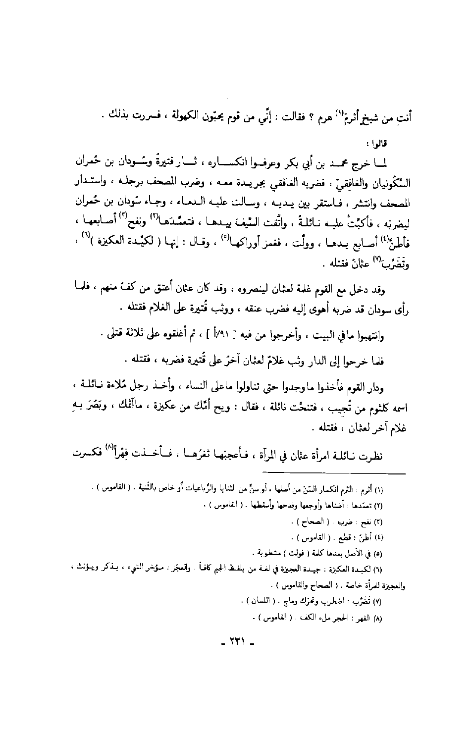 قالوا: لما خرج محمد بن أبي بكر وعرفوا انكساره، ثار قتيرة وسودان بن حمران السكونيان والغافقي، فضربه الغافقي بجريدة معه، وضرب المصحف برجله، واستدار المصحف وانتشر، فاستقر بين يديه، وسالت عليه الدماء، وجاء سودان بن حمران ليضربه، فأكبت عليه نائلة، واتقت السيف بيدها، فتعمدها ونفح أصابعها، فأطن أصابع يدها، وولت، فغمز أوراكها، وقال: إنها لكيدة العكيزة، وتضرب عثمان فقتله.