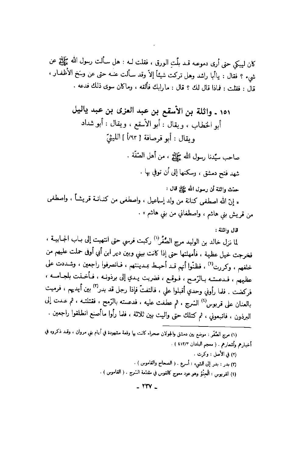 قال واثلة: لما نزل خالد بن الوليد مرج الصفر ركبت فرسي حتى انتهيت إلى باب الجابية، فخرجت خيل عظيمة، فأمهلتها حتى إذا كانت بيني وبين دير ابن أبي أوفى حملت عليهم من خلفهم، وكررت، فظنوا أنهم قد أحيط بمدينتهم، فانصرفوا راجعين، وشددت على عظيمهم، فدعسته بالرمح، فوقع، فضربت يدي إلى برذونه، فأخذت بلجامه، فركضت. فلما رأوني وحدي أقبلوا علي، فالتفت فإذا رجل قد بدر بين أيديهم، فرميت بالعنان على قربوس السرج، ثم عطفت عليه، فدعسته بالرمح، فقتلته، ثم عدت إلى البرذون، فاتبعوني، ثم كتلك حتى واليت بين ثلاثة، فلما رأوا ما أصنع انطلقوا راجعين.
