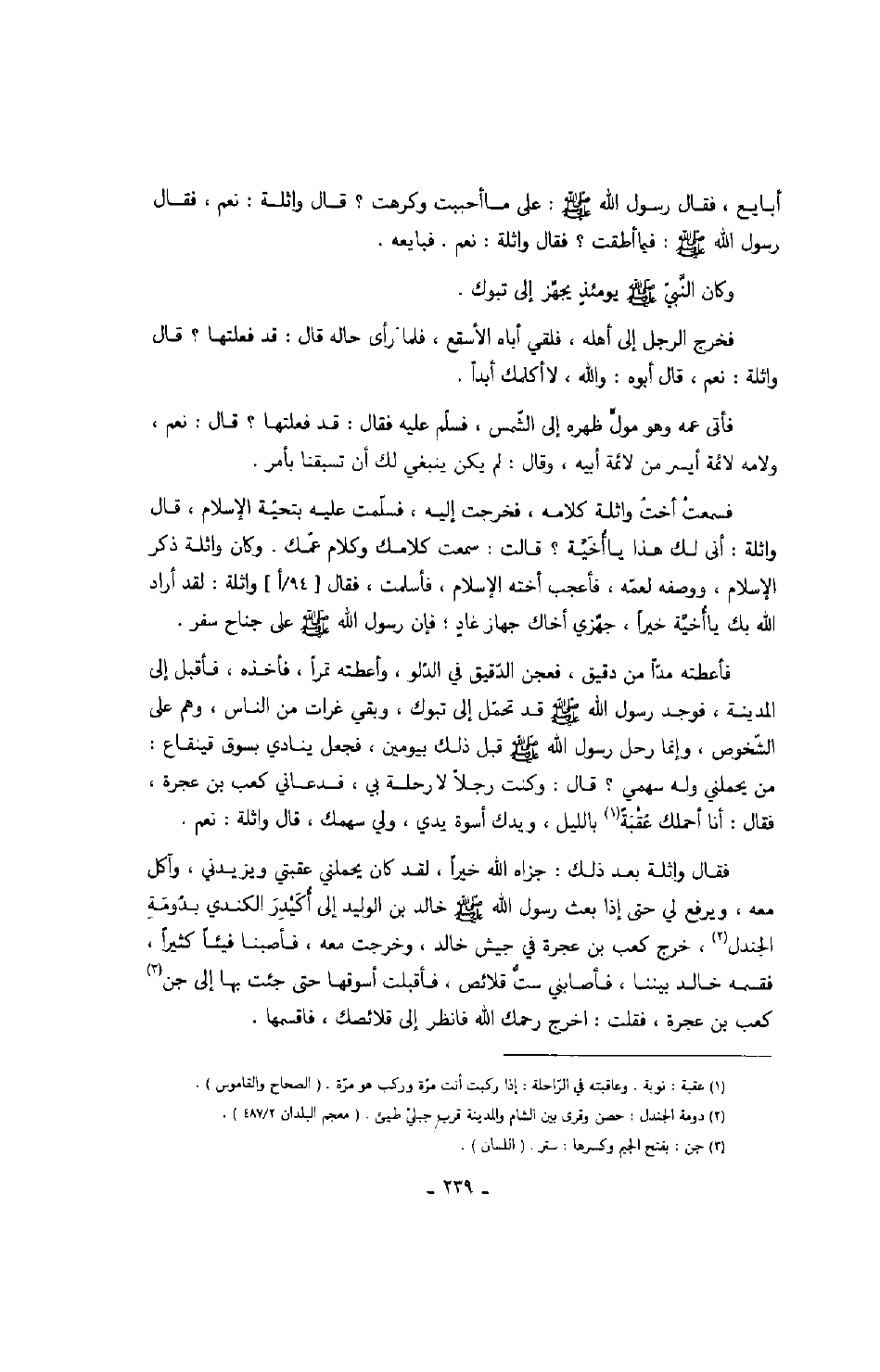 فأعطته مداً من دقيق، فعجن الدقيق في الدلو، وأعطته تمراً، فأخذه، فأقبل إلى المدينة، فوجد رسول الله صَلَّى اللهُ عَلَيْهِ وَسَلَّمَ قد تحمل إلى تبوك، وبقي غرات من الناس، وهم على الشخوص، وإنما رحل رسول الله صَلَّى اللهُ عَلَيْهِ وَسَلَّمَ قبل ذلك بيومين، فجعل ينادي بسوق قينقاع: من يحملني وله سهمي؟ قال: وكنت رجلاً لا رحلة بي، فدعاني كعب بن عجرة، فقال: أنا أحملك عقبةً بالليل، ويدك أسوة يدي، ولي سهمك، قال واثلة: نعم.