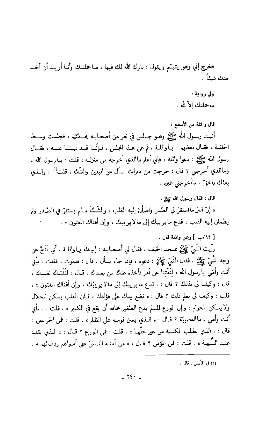 رأيت النبي صَلَّى اللهُ عَلَيْهِ وَسَلَّمَ بمسجد الخيف، فقال لي أصحابه: إليك يا واثلة، أي تنح عن وجه النبي صَلَّى اللهُ عَلَيْهِ وَسَلَّمَ، فقال النبي صَلَّى اللهُ عَلَيْهِ وَسَلَّمَ: دعوه، فإنما جاء يسأل. قال: فدنوت، فقلت: بأبي أنت وأمي يا رسول الله، لتفتنا عن أمر نأخذه عنك من بعدك، قال: لتفتك نفسك، قال: وكيف لي بذلك؟ قال: " تدع ما يريبك إلى ما لا يريبك، وإن أفتاك المفتون "، قلت: وكيف لي بعلم ذلك؟ قال: " تضع يدك على فؤادك، فإن القلب يسكن للحلال ولا يسكن للحرام، وإن الورع المسلم يدع الصغير مخافة أن يقع في الكبير "، قلت: - بأبي أنت وأمي - ما العصبية؟ قال: " الذي يعين قومه على الظلم ". قلت: فمن الحريص: قال: " الذي يطلب المكسبة من غير حلها ". قلت: فمن الورع؟ قال: " الذي يقف عند الشبهة ". قلت: فمن المؤمن؟ قال: " من أمنه الناس على أموالهم ودمائهم ".