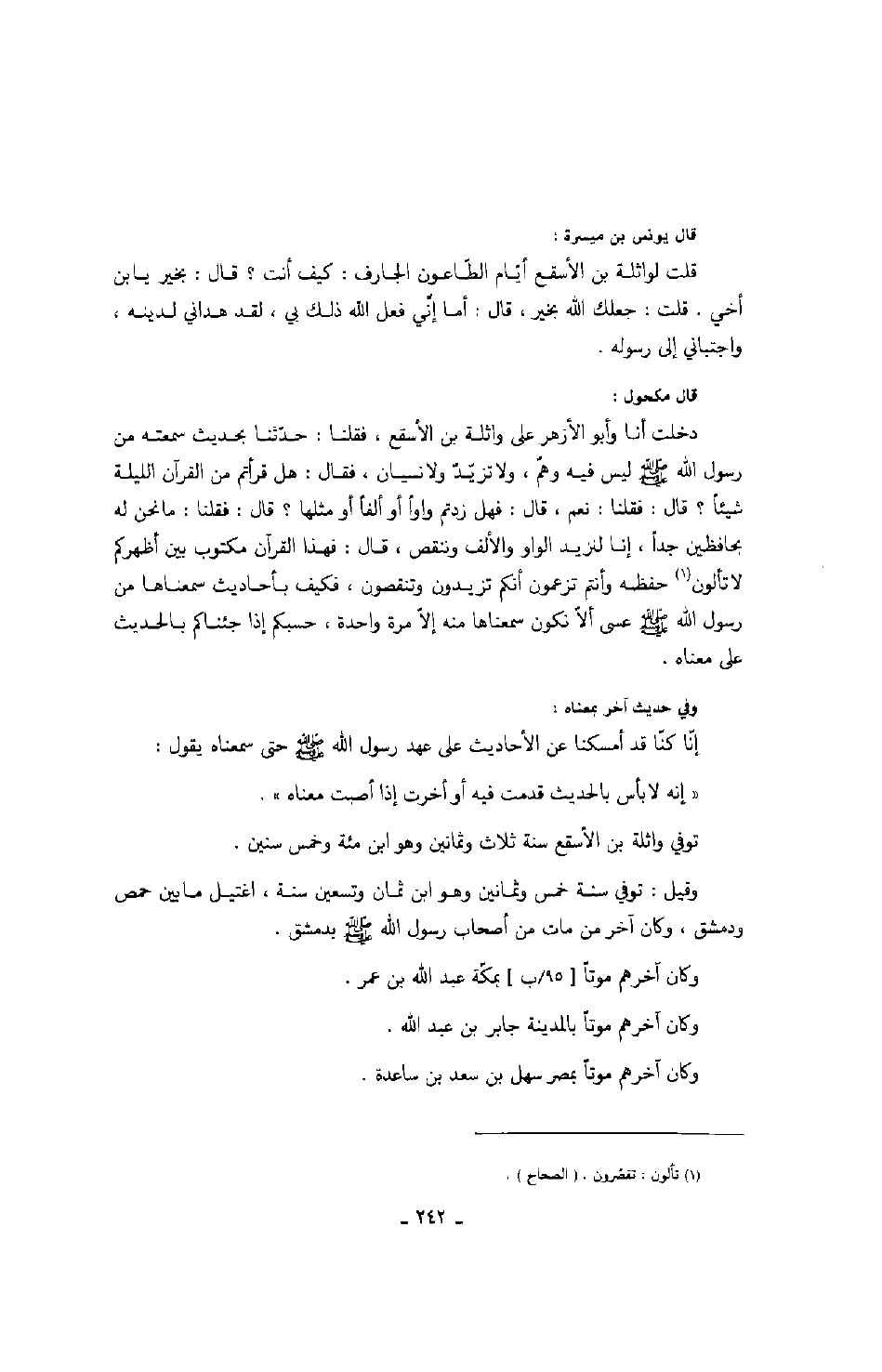 قال مكحول: دخلت أنا وأبو الأزهر على واثلة بن الأسقع، فقلنا: حدثنا بحديث سمعته من رسول الله صَلَّى اللهُ عَلَيْهِ وَسَلَّمَ ليس فيه وهم، ولا تزيد ولا نسيان، فقال: هل قرأتم من القرآن الليلة شيئاً؟ قال: فقلنا: نعم، قال: فهل زدتم واواً أو ألفاً أو مثلها؟ قال: فقلنا: ما نحن له بحافظين جداً، إنا لنزيد الواو والألف وننقص، قال: فهذا القرآن مكتوب بين أظهركم لا تألون حفظه وأنتم تزعمون أنكم تزيدون وتنقصون، فكيف بأحاديث سمعناها من رسول الله صَلَّى اللهُ عَلَيْهِ وَسَلَّمَ عسى ألا نكون سمعناها منه إلا مرة واحدة، حسبكم إذا جئناكم بالحديث على معناه.