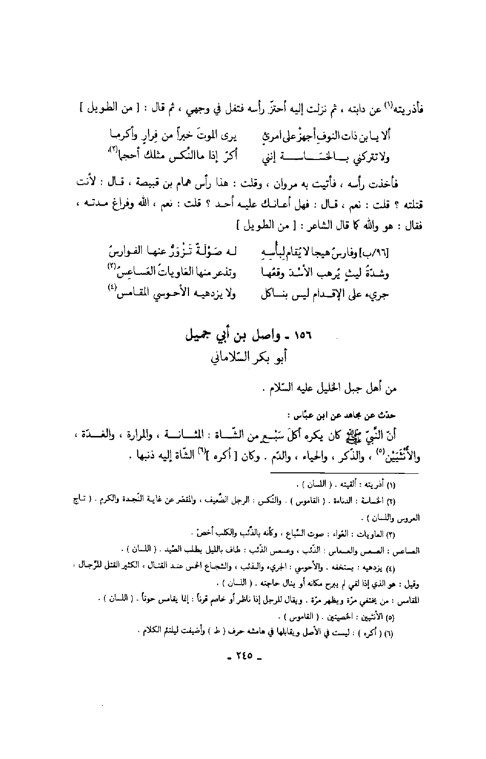 فأذريته عن دابته، ثم نزلت إليه أحتز رأسه فتفل في وجهي، ثم قال: من الطويل