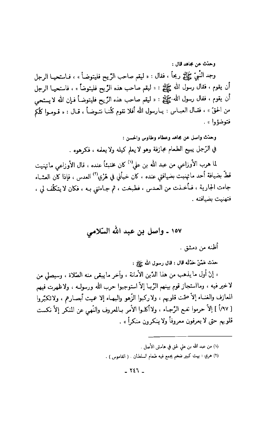 وحدث عن مجاهد قال: وجد النبي صَلَّى اللهُ عَلَيْهِ وَسَلَّمَ ريحاً، فقال: " ليقم صاحب الريح فليتوضأ "، فاستحيا الرجل أن يقوم، فقال رسول الله صَلَّى اللهُ عَلَيْهِ وَسَلَّمَ: " ليقم صاحب هذه الريح فليتوضأ "، فاستحيا الرجل أن يقوم، فقال رسول الله صَلَّى اللهُ عَلَيْهِ وَسَلَّمَ: " ليقم صاحب هذه الريح فليتوضأ فإن الله لا يستحي من الحق "، فقال العباس: يا رسول الله أفلا نقوم كلنا نتوضأ، قال: " قوموا كلكم فتوضؤوا ".