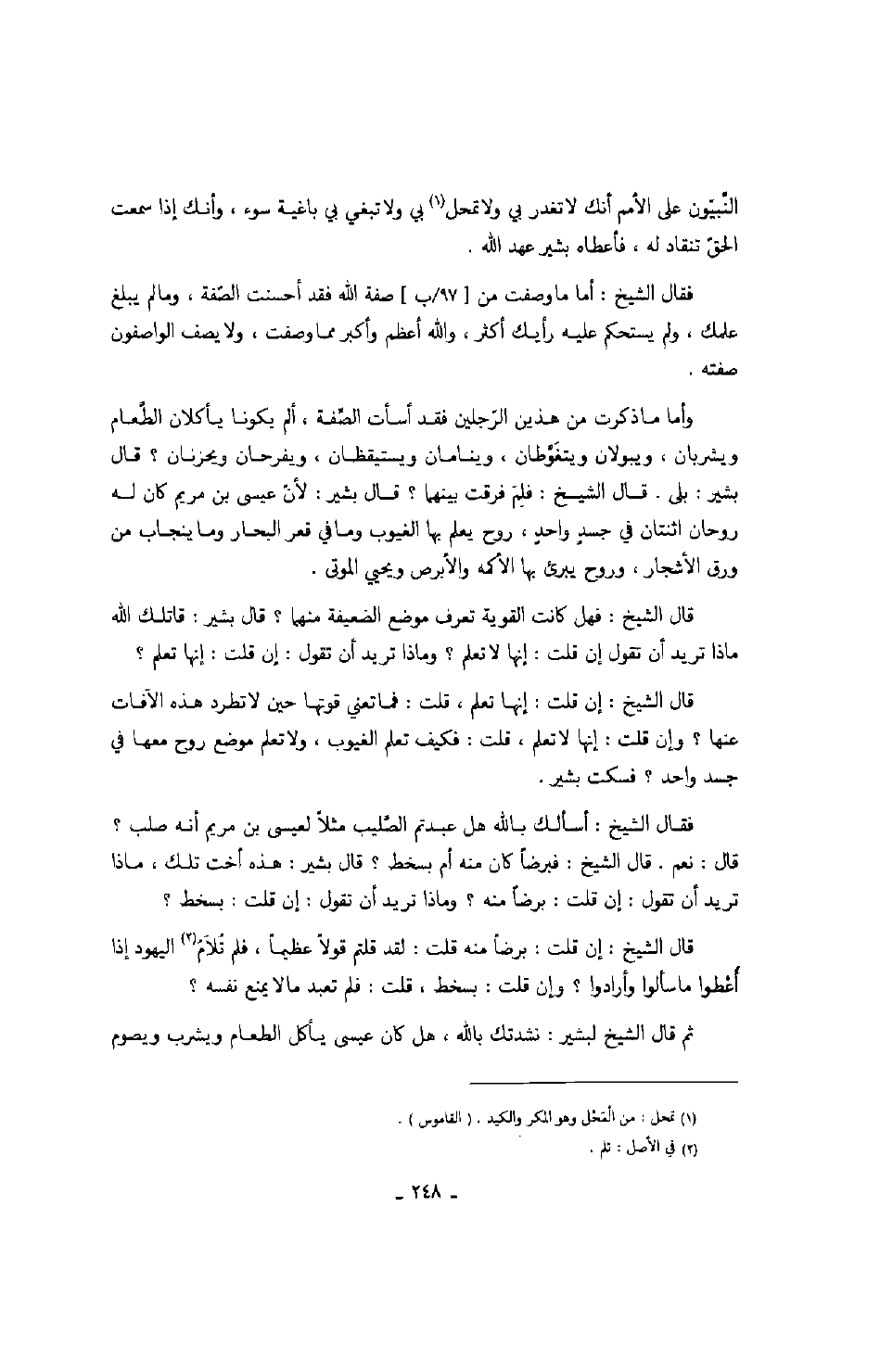 وأما ما ذكرت من هذين الرجلين فقد أسأت الصفة، ألم يكونا يأكلان الطعام ويشربان، ويبولان ويتغوطان، وينامان ويستيقظان، ويفرحان ويحزنان؟ قال: بشير: بلى. قال الشيخ: فلم فرقت بينهما؟ قال بشير: لأن عيسى بن مريم كان له روحان اثنتان في جسد واحد، روح يعلم بها الغيوب وما في قعر البحار وما ينجاب من ورق الأشجار، وروح يبرئ بها الأكمه والأبرص ويحيي الموتى.