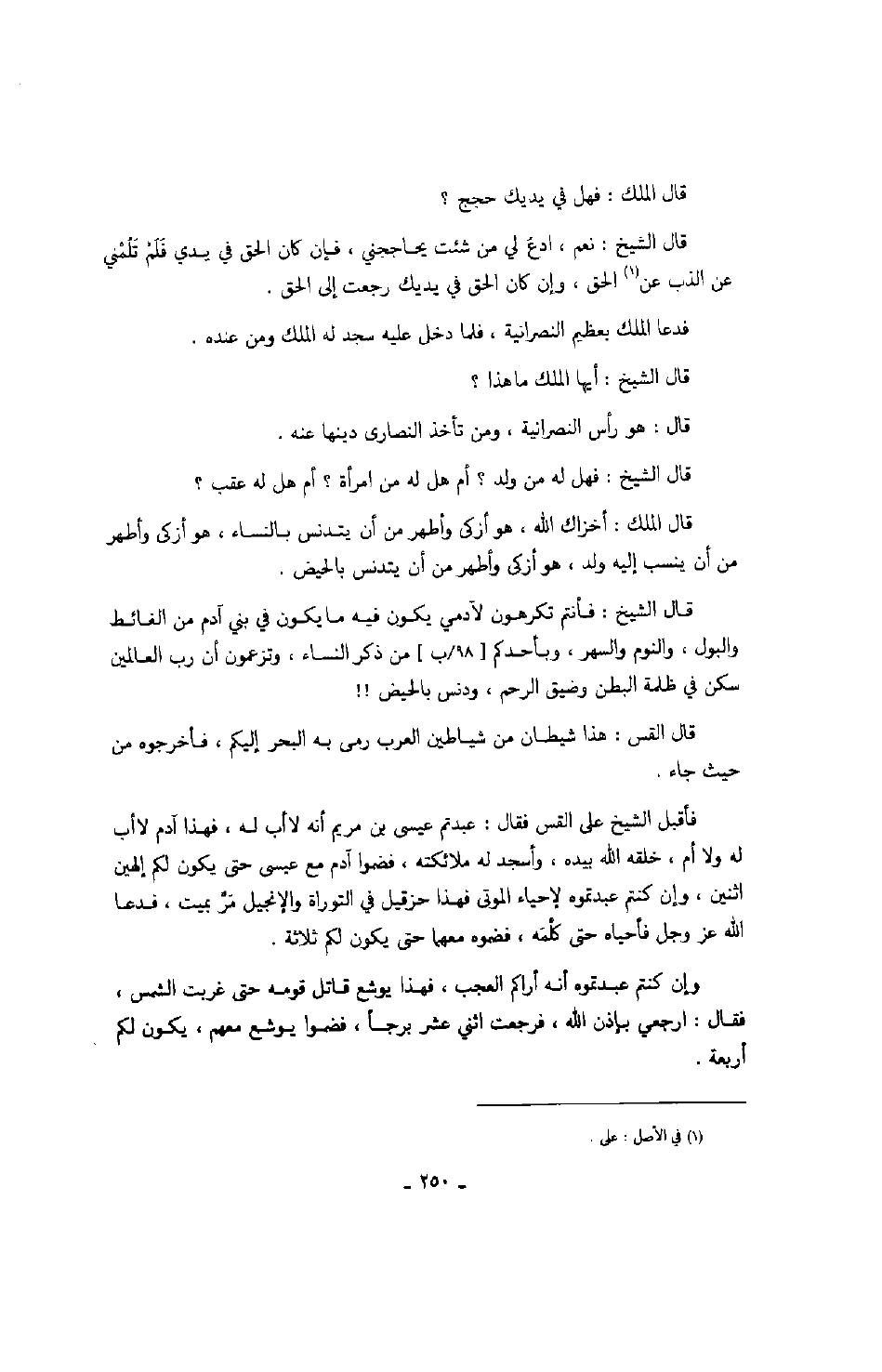 قال الشيخ: فأنتم تكرهون لآدمي يكون فيه ما يكون في بني آدم من الغائط والبول، والنوم والسهر، وبأحدكم من ذكر النساء، وتزعمون أن رب العالمين سكن في ظلمة البطن وضيق الرحم، ودنس بالحيض!! قال القس: هذا شيطان من شياطين العرب رمى به البحر إليكم، فأخرجوه من حيث جاء.