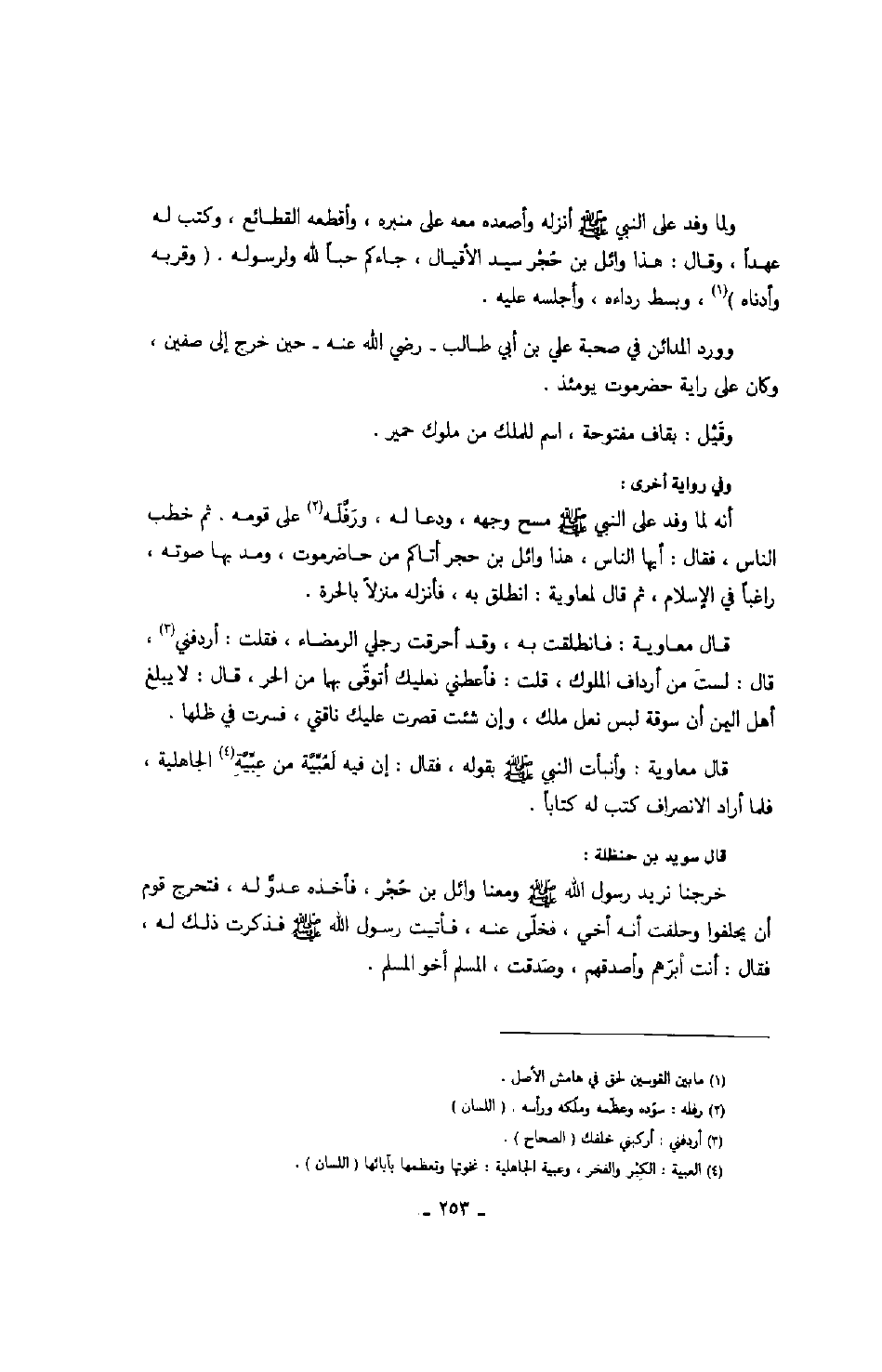 وفي رواية أخرى: أنه لما وفد على النبي صَلَّى اللهُ عَلَيْهِ وَسَلَّمَ مسح وجهه، ودعا له، ورفله على قومه. ثم خطب الناس، فقال: أيها الناس، هذا وائل بن حجر أتاكم من حاضرموت، ومد بها صوته، راغباً في الإسلام، ثم قال لمعاوية: انطلق به، فأنزله منزلاً بالحرة.