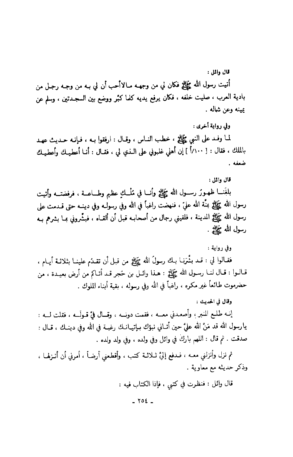 وفي رواية: فقالوا لي: قد بشرنا بك رسول الله صَلَّى اللهُ عَلَيْهِ وَسَلَّمَ من قبل أن تقدم علينا بثلاثة أيام، قالوا: قال لنا رسول الله صَلَّى اللهُ عَلَيْهِ وَسَلَّمَ: هذا وائل بن حجر قد أتاكم من أرض بعيدة، من حضرموت طائعاً غير مكره، راغباً في الله وفي رسوله، بقية أبناء الملوك.