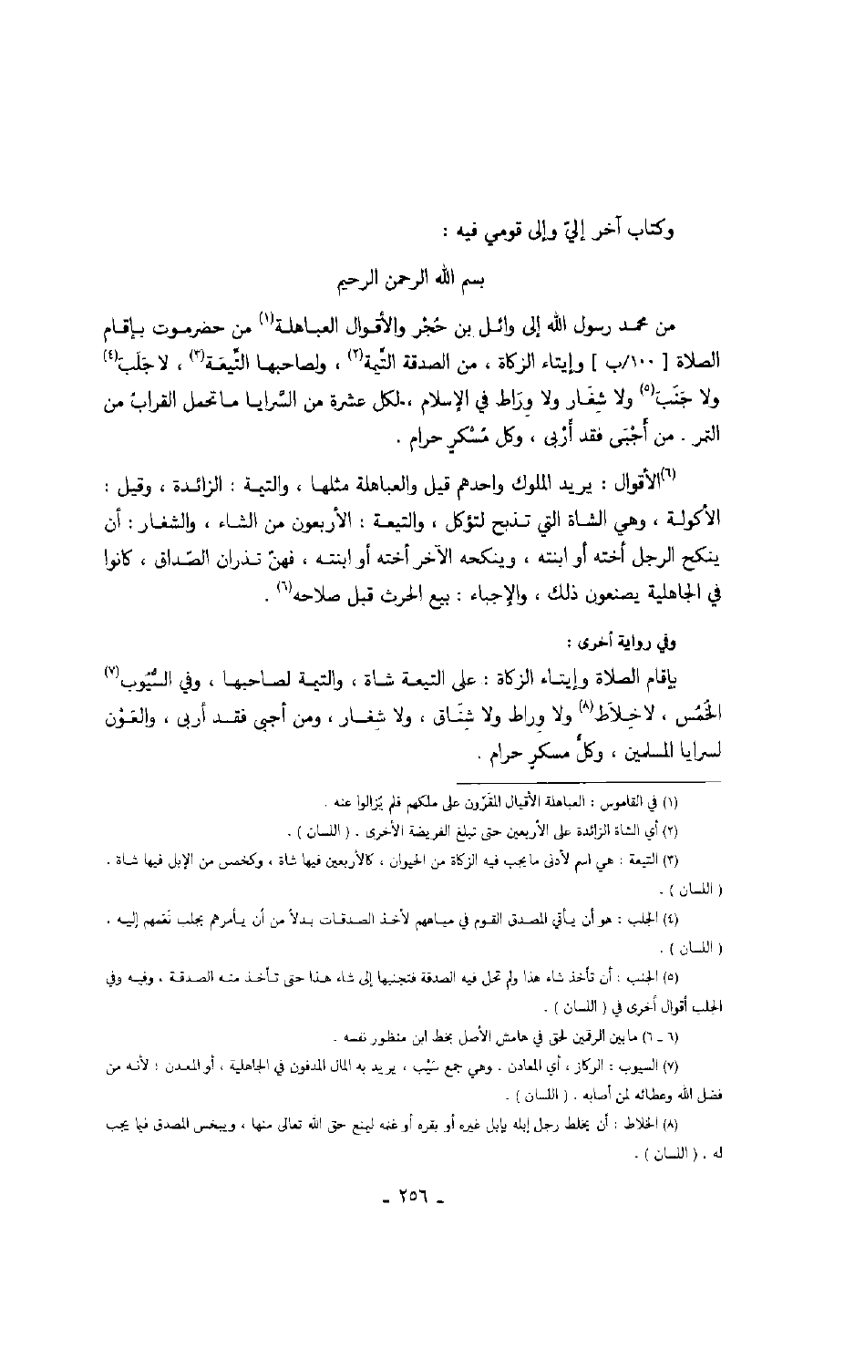 وكتاب آخر إلي وإلى قومي فيه: بسم الله الرحمن الرحيم من محمد رسول الله إلى وائل بن حجر والأقوال العباهلة من حضرموت بإقام الصلاة وإيتاء الزكاة، من الصدقة التيمة، ولصاحبها التيعة، لاجلب ولاجنب ولاشغار ولا وراط في الإسلام، لكل عشرة من السرايا ما تحمل القراب من التمر. من أجبى فقد أربى، وكل مسكرٍ حرام.