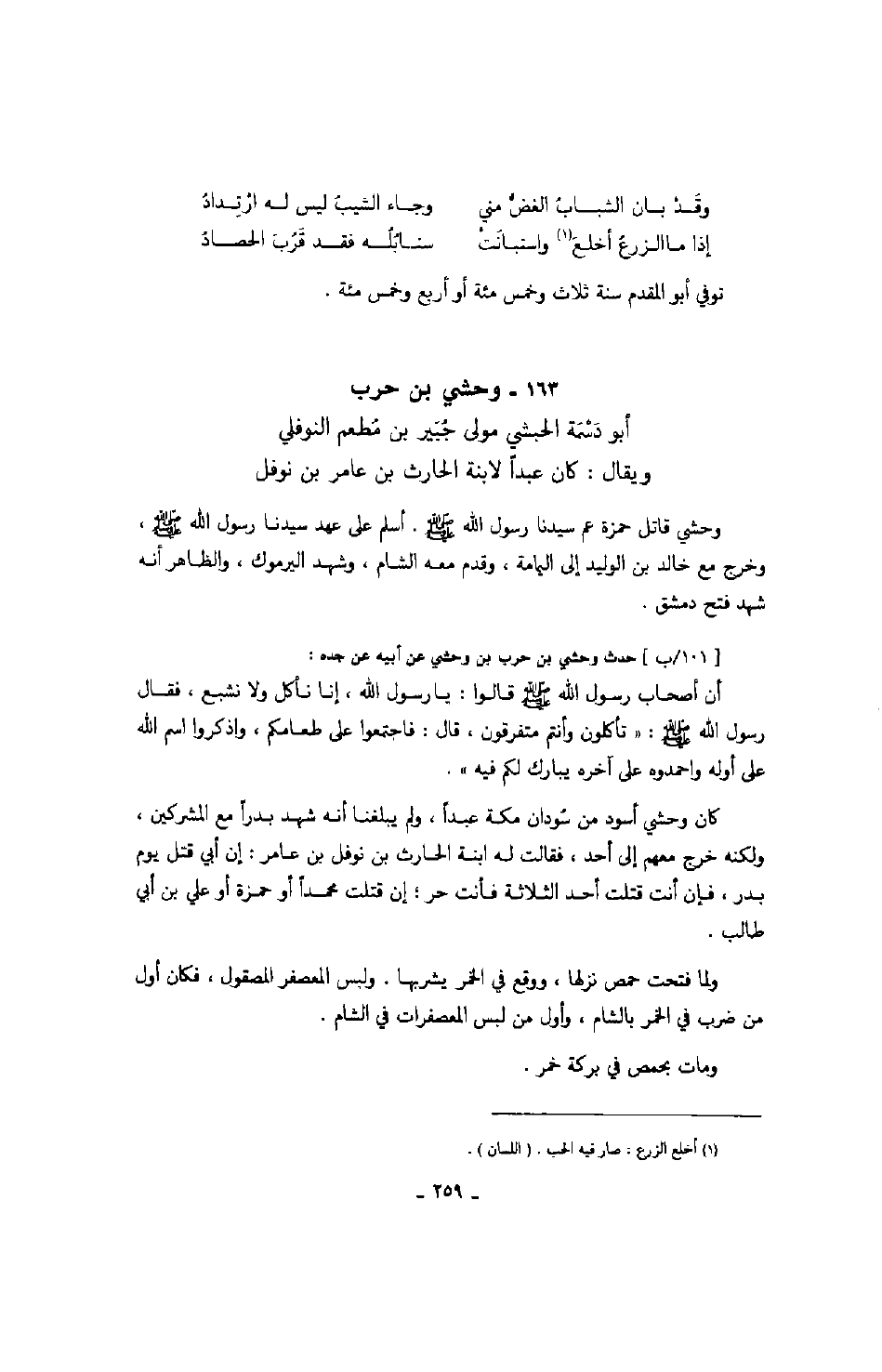 حدث وحشي بن حرب بن وحشي عن أبيه عن جده: أن أصحاب رسول الله صَلَّى اللهُ عَلَيْهِ وَسَلَّمَ قالوا: يا رسول الله، إنا نأكل ولا نشبع، فقال رسول الله صَلَّى اللهُ عَلَيْهِ وَسَلَّمَ: " تأكلون وأنتم متفرقون، قال: فاجتمعوا على طعامكم، واذكروا اسم الله على أوله واحمدوه على آخره يبارك لكم فيه ".