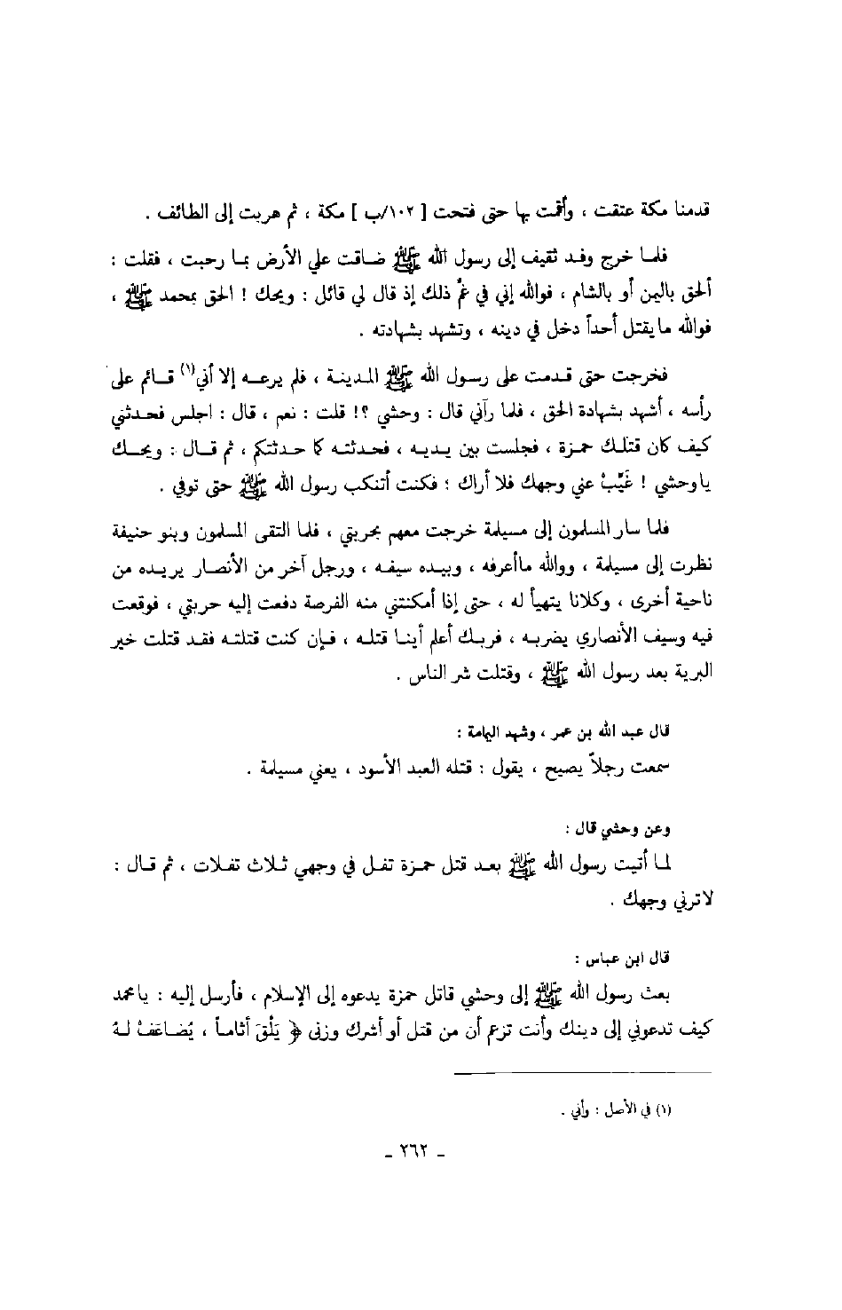 فخرجت حتى قدمت على رسول الله صَلَّى اللهُ عَلَيْهِ وَسَلَّمَ المدينة، فلم يرعه إلا أني قائم على رأسه، أشهد بشهادة الحق، فلما رآني قال: وحشي؟! قلت: نعم، قال: اجلس فحدثني كيف كان قتلك حمزة، فجلست بين يديه، فحدثته كما حدثتكم، ثم قال: ويحك يا وحشي! غيب عني وجهك فلا أراك؛ فكنت أتنكب رسول الله صَلَّى اللهُ عَلَيْهِ وَسَلَّمَ حتى توفي.
